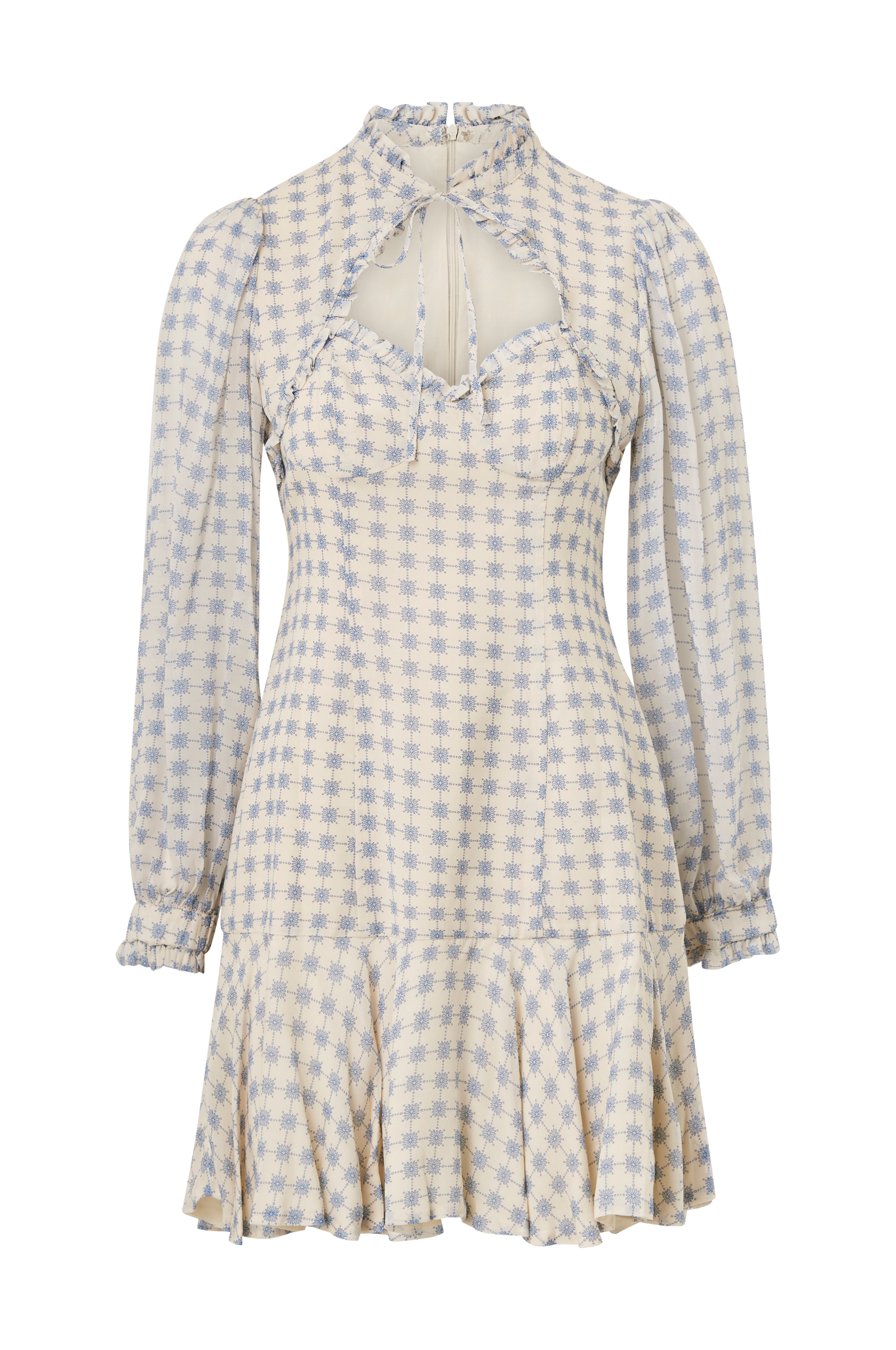 • Kort kjole i viskose• Knytbar tråd i halsen• Volangkant i halsen og ved bysten• Diamantformet åpning foran• Gjennomsiktige ballongermer• Volang på bunnen• Skjult glidelås i ryggen• Fôret• Lengde: 85 cm i størrelse S