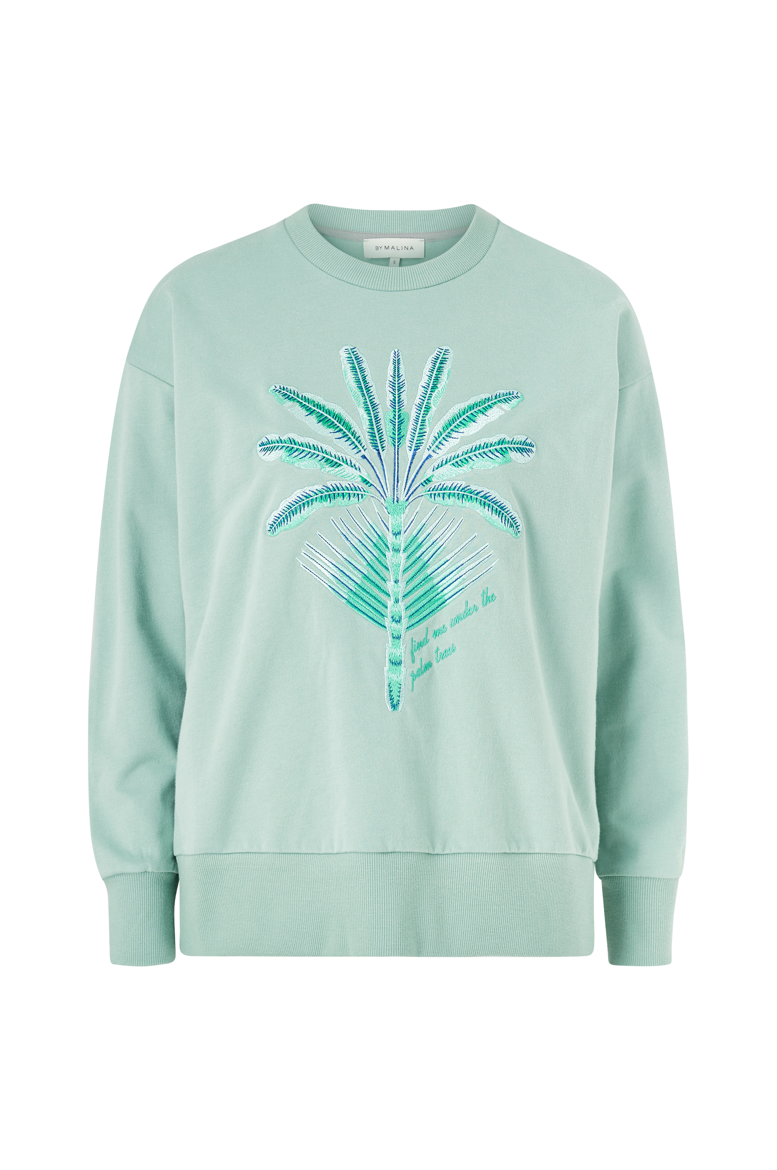 Sweatshirt Nora fra By Malina. Rett oversizemodell med stort broderi foran og lave skuldersømmer med lange ermer. Rund hals med vrangbord, vrangbord i erme- og nederkant.