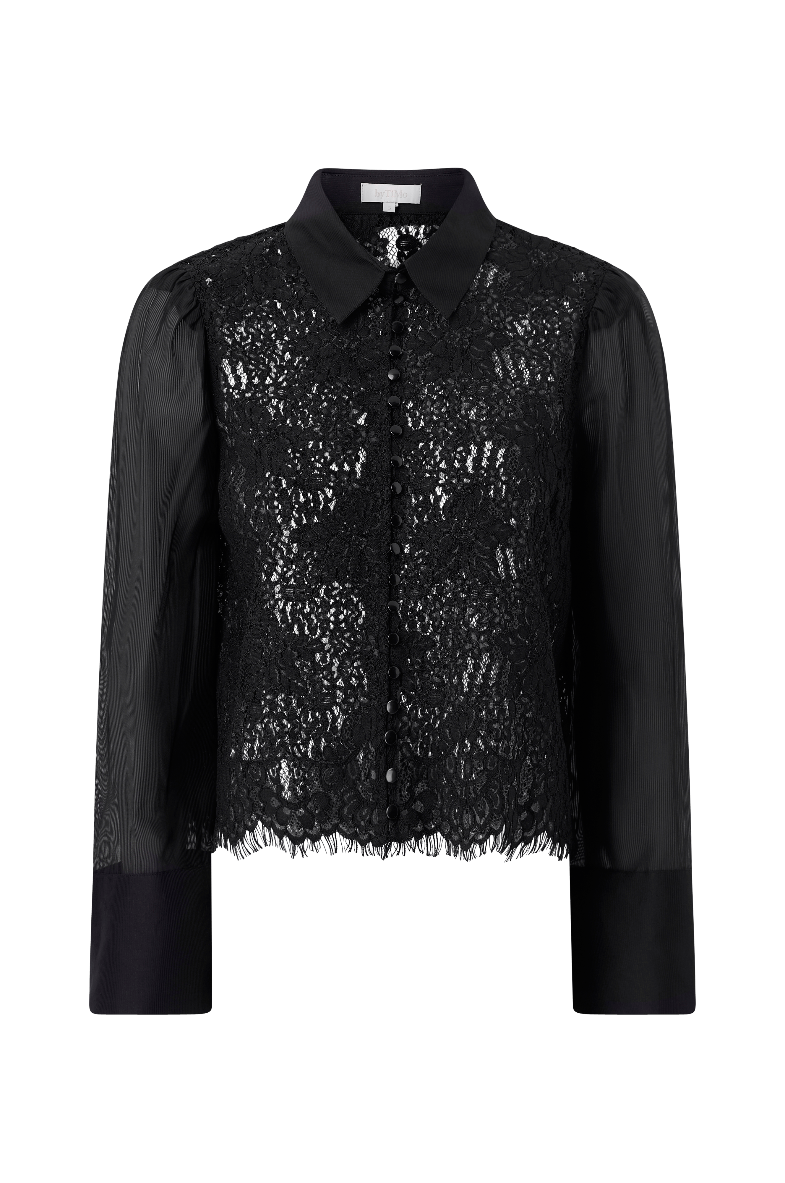 • Bluse i blonde med ermer i organza• Brede mansjetter• Klassisk krage• Knappelukking foran• Rå hem med frynser