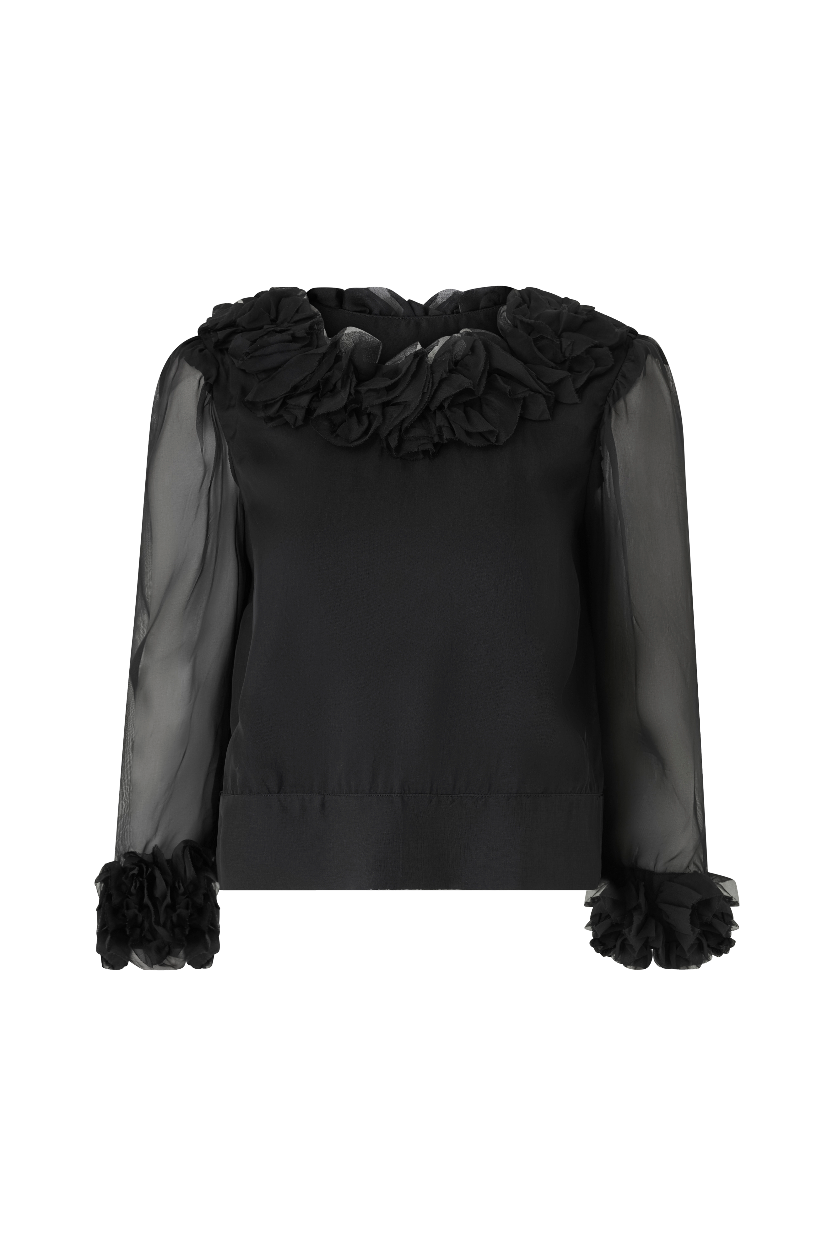 • Fôret bluse i organza• Rund hals med v-hals snitt i ryggen• Ufôrete ermer 3/4 lang• Applique på halslinjen og ved armenden