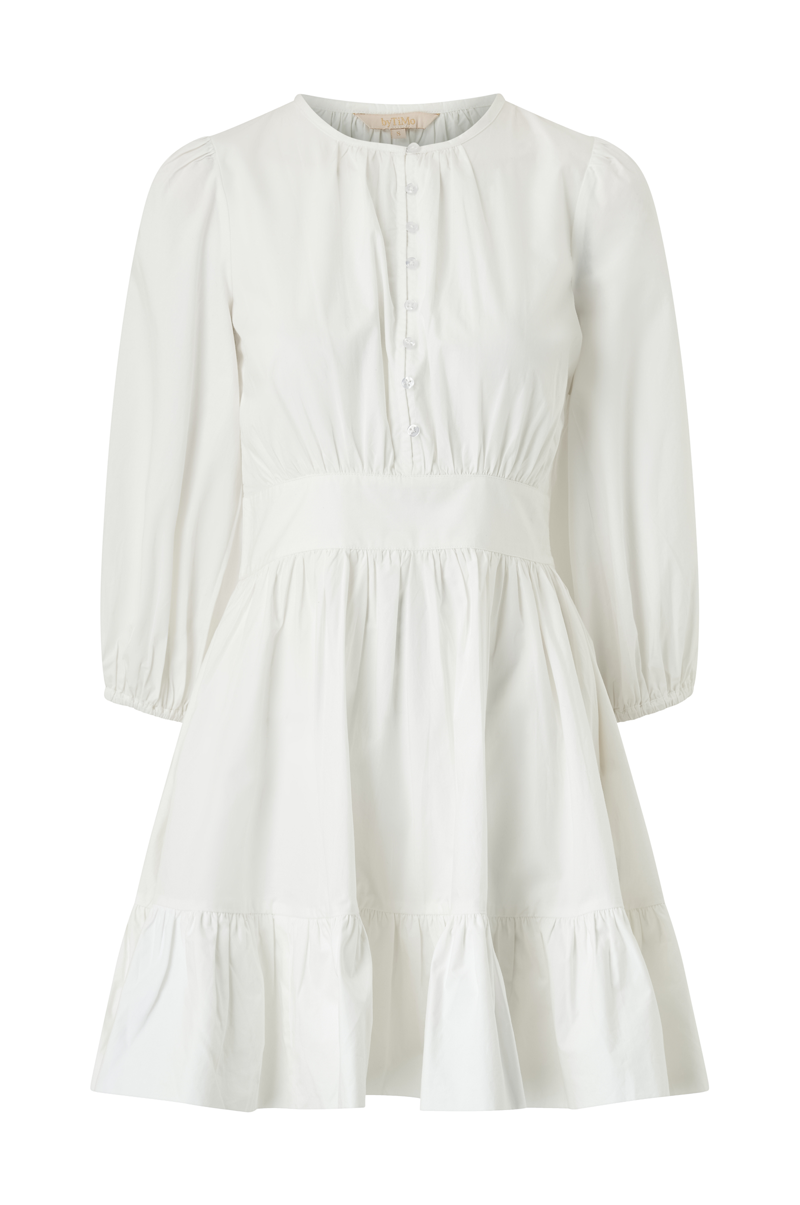 • Kort kjole• Rund halsringning• Ballongermer 3/4 lang• Lukking foran• Vaffelsøm i midjen bak• Glidelåslukking i ene siden• Volang i nedre kant• Lengde: 86 cm i størrelse S