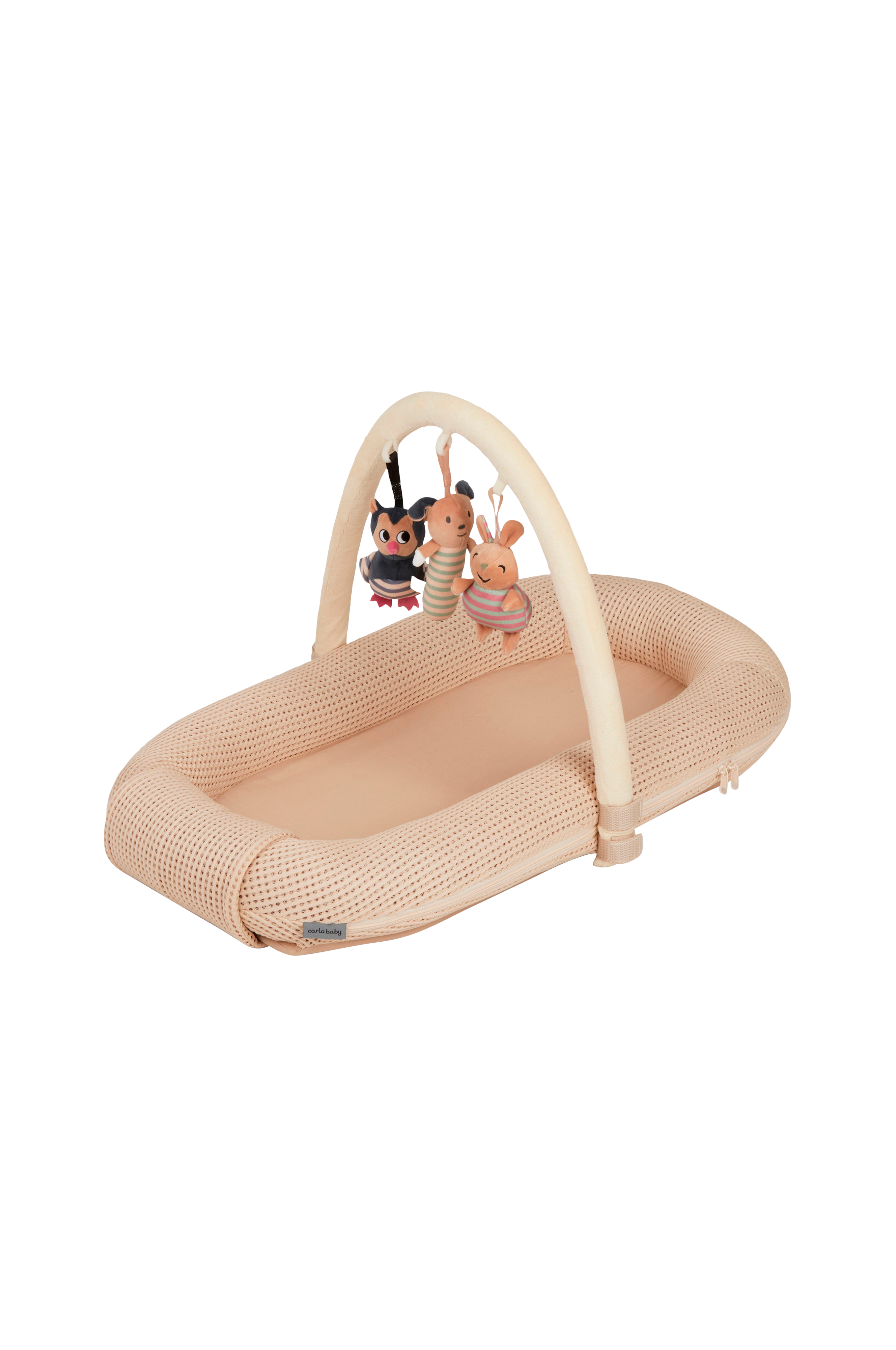Babynest med avtagbart stoff av myk bomullsbase og barriere i vaflet bomullsstoff.