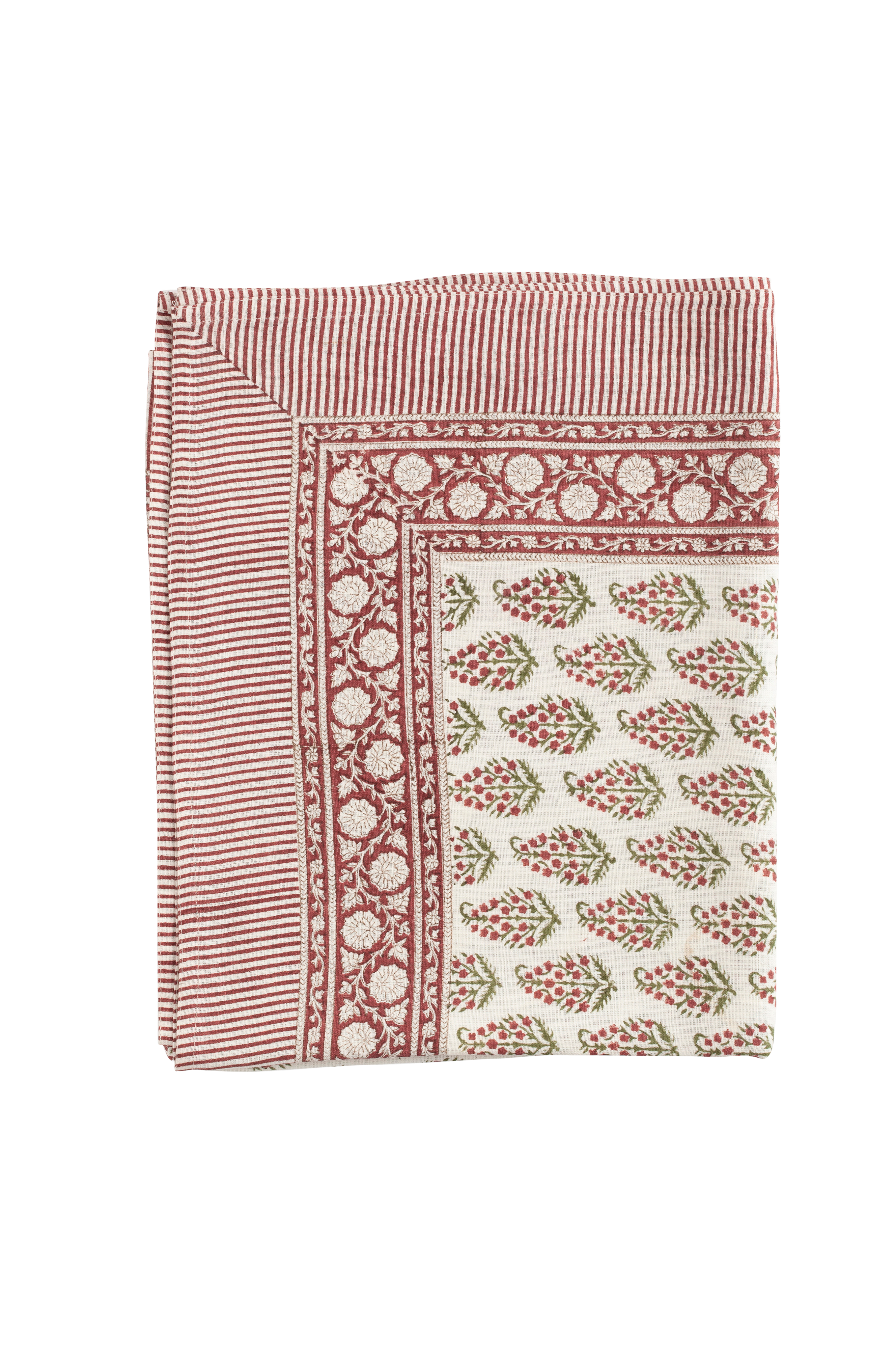 En eksklusiv duk i kraftig lin med et sjarmerende paisley -mønster og en dekorativ kant. Mønsteret er trykt for hånd ved hjelp av tradisjonelle indiske blokktrykkteknikker. Et unikt håndverk som gir hver duk et unikt og dekorativt uttrykk. Duken vaskes på et kort (maks 1 time) og skånsomt program for ull/silke med mildt vaskemiddel.