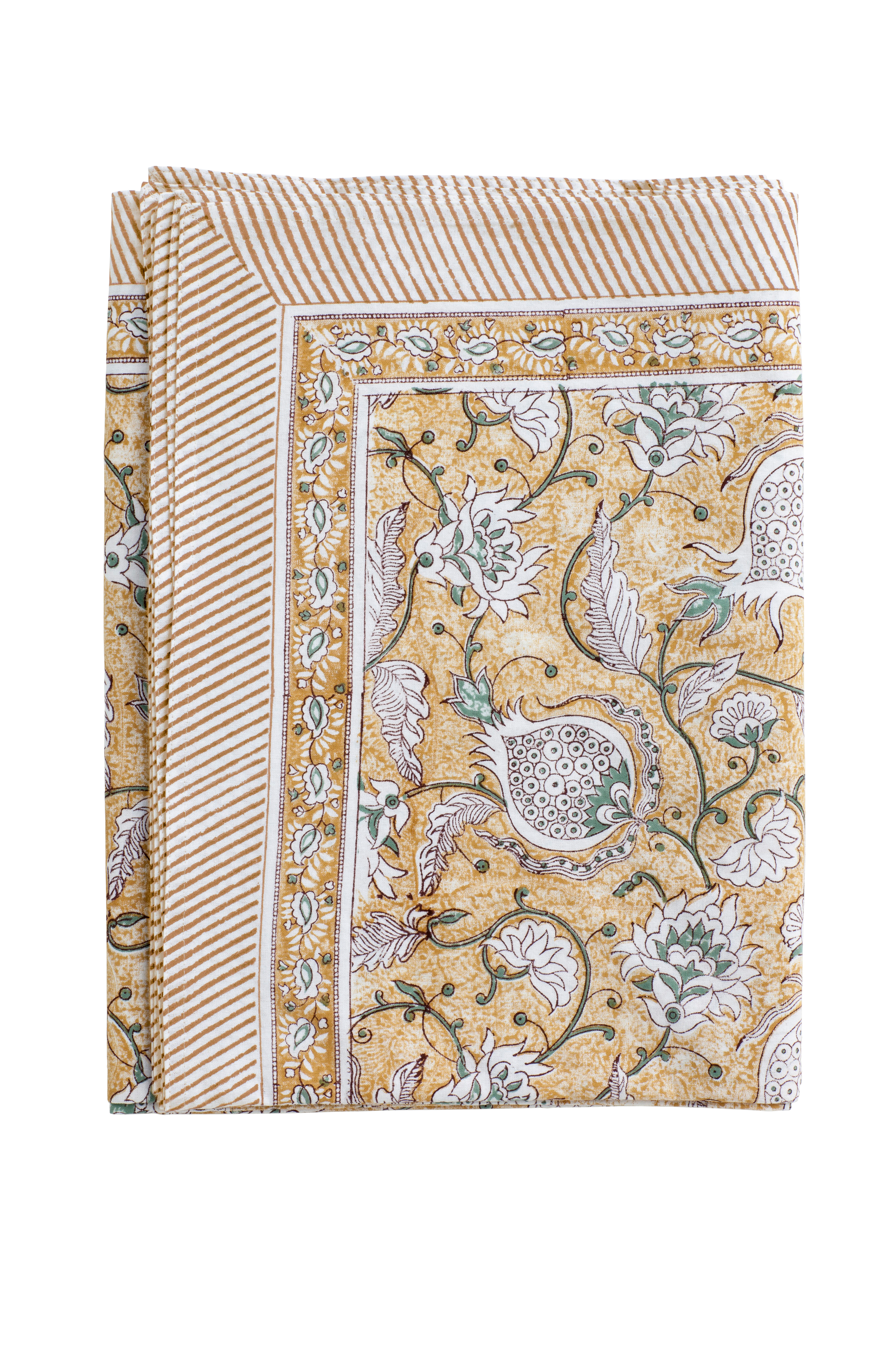 Vakker bomullsduk fra varemerket Chamois med et elegant og eksotisk mønster. Mønsteret er trykt for hånd med tradisjonell indisk blokktrykkteknikk. Et unik håndverk som gir duken et levende og dekorativt uttrykk.