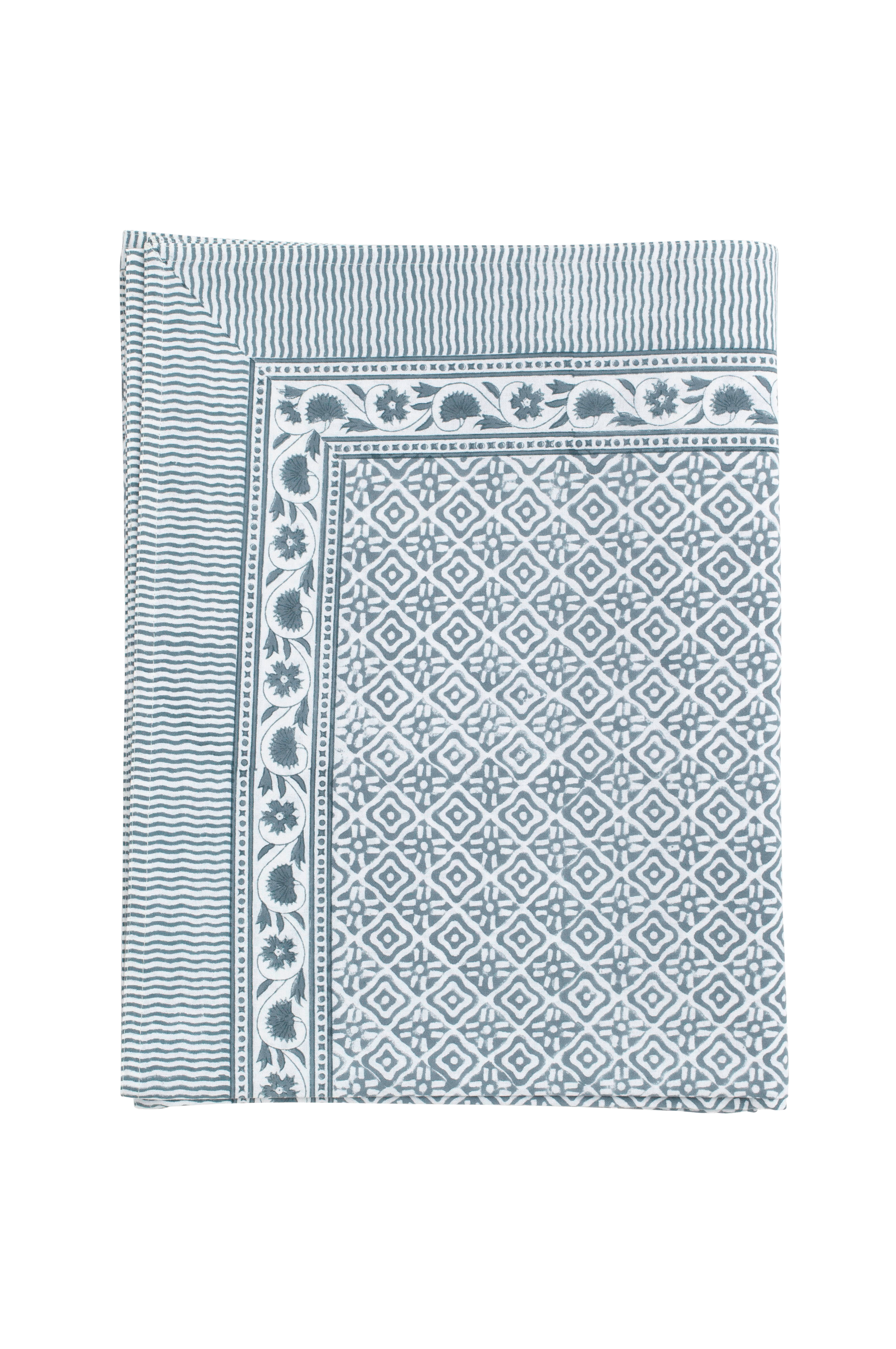En vakker duk med dekorativt mønster og ornamental kant. Hver duk er omhyggelig håndtrykt ved hjelp av den eldgamle tresnittkunsten, en ærverdig teknikk som gir dybde, tekstur og sjel til hvert eneste tekstil.