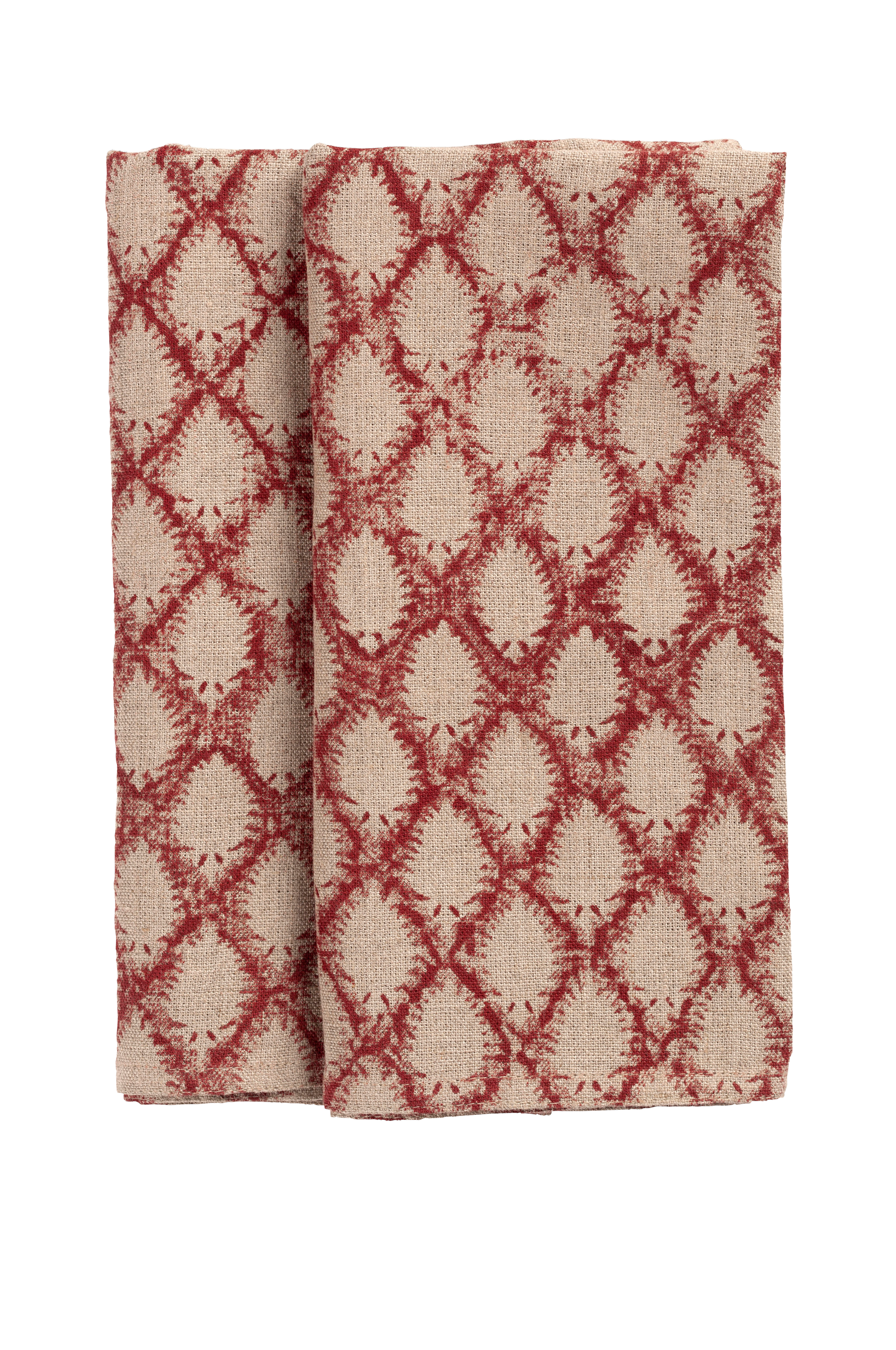 To mønstrete linservietter. Mønsteret er trykt for hånd med tradisjonell indisk blokktrykkteknikk. Den håndlagde teknikken gjør hver serviett unik, og gir et levende og dekorativt uttrykk.
