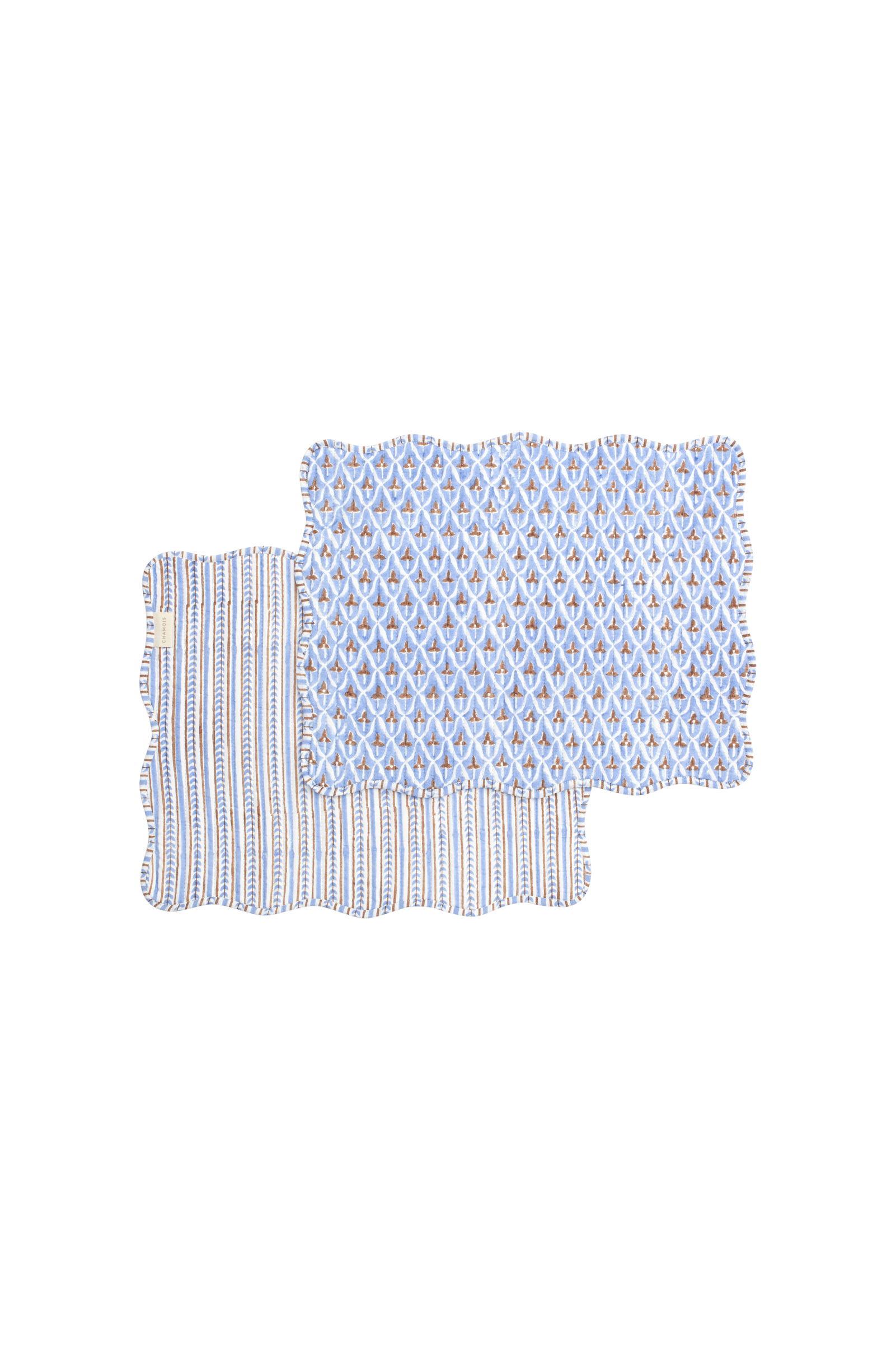 Sett med to dekorative, vatterte borddekkeservietter med en sjarmerende kamskjellkant, laget av Gots sertifisert økologisk bomull. Hver serviett er omhyggelig håndtrykt ved hjelp av den eldgamle tresnittkunsten, en gammel teknikk som gir dybde, tekstur og sjel til hvert tekstil. Vask de håndtrykte serviettene på et kort (maks. 1 time) og skånsomt program for ull/silke med mildt vaskemiddel. Strykes som bomull. Størrelsen er 35x43 cm.