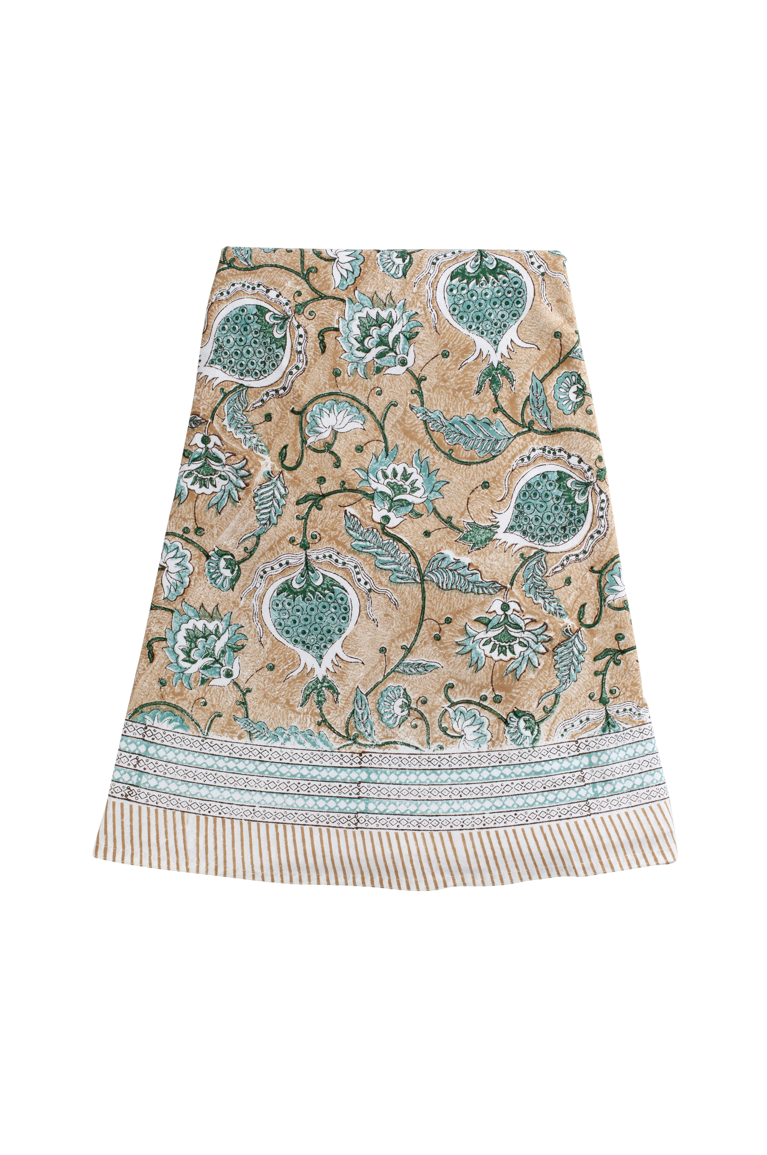 Vakker rund bomullsduk med eksotisk mønster og dekorativ bord. Mønsteret er trykt for hånd med tradisjonell indisk blokktrykkteknikk. Et unik håndverk som gir duken et levende og dekorativt uttrykk.