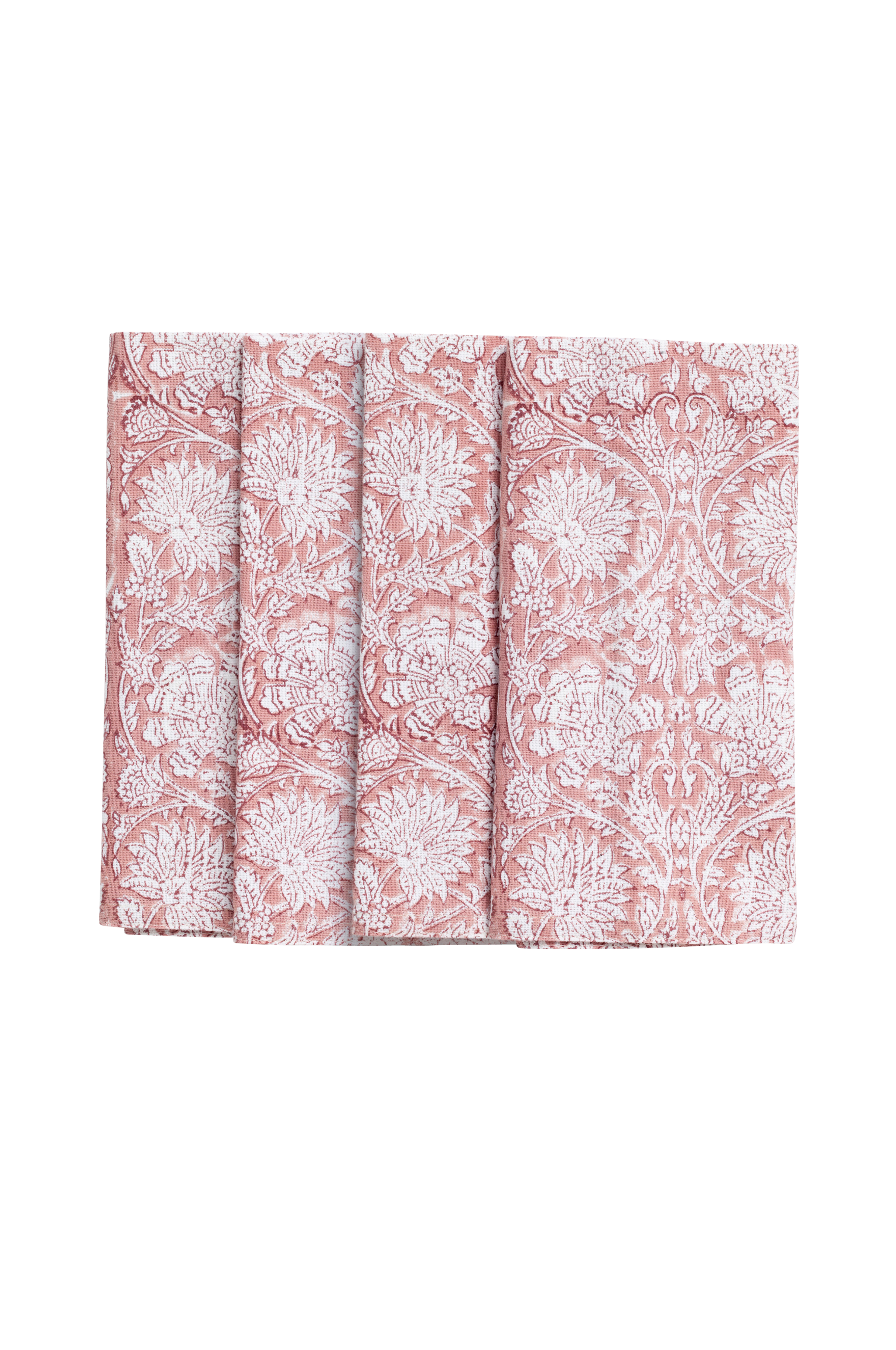 Fire herlige servietter i bomull. Håndtrykt mønster i tradisjonell indisk blokktrykkteknikk. Den håndlagde teknikken gir mønsteret et vakkert og levende uttrykk. Et unikt håndverk!