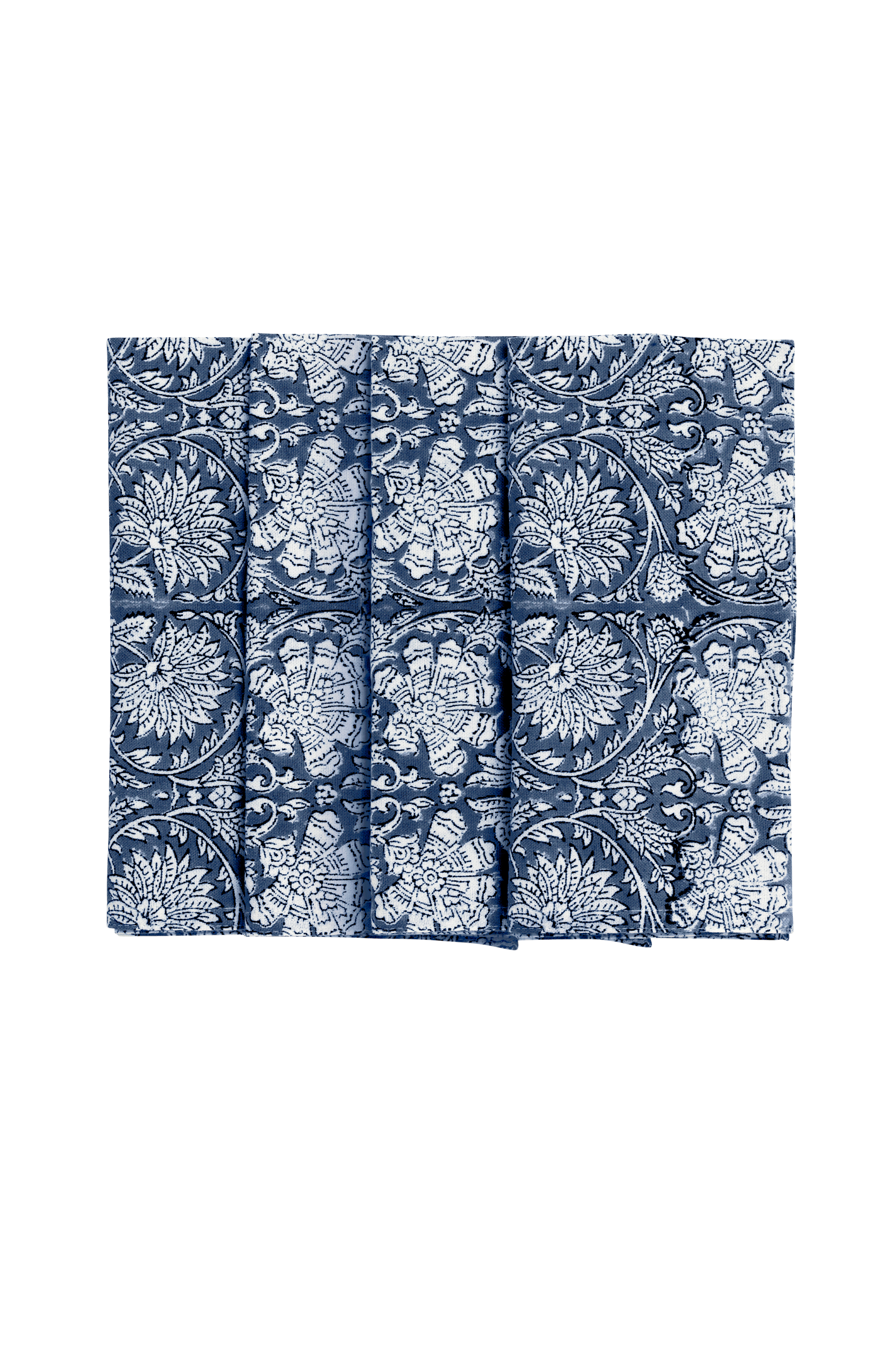 Fire herlige servietter i bomull. Håndtrykt mønster i tradisjonell indisk blokktrykkteknikk. Den håndlagde teknikken gir mønsteret et vakkert og levende uttrykk. Et unikt håndverk!