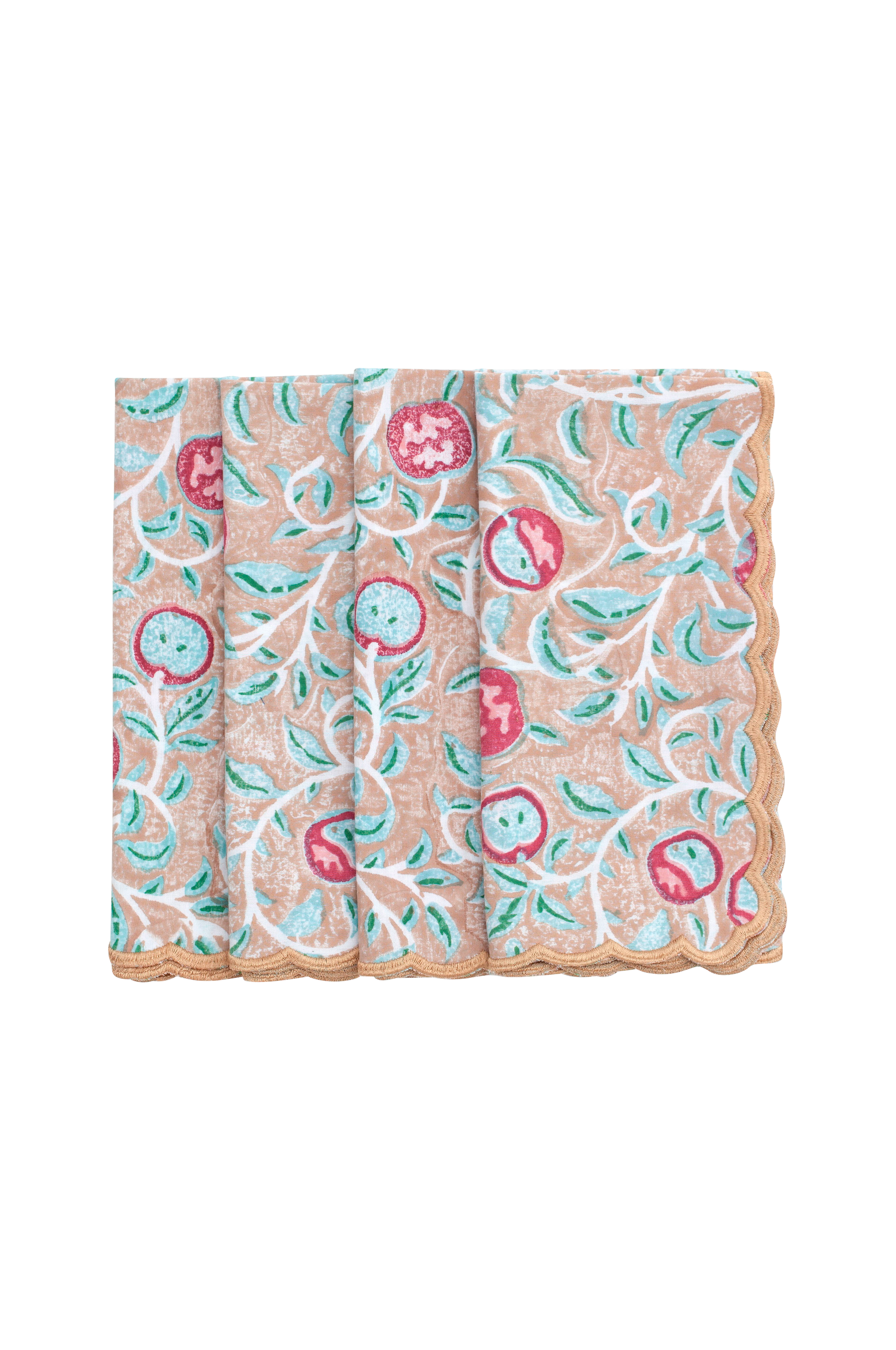 Sett med fire dekorative bomullsservietter med scallop -kant. Hver serviett er omhyggelig håndtrykt ved hjelp av den eldgamle tresnittkunsten, en gammel teknikk som gir dybde, tekstur og sjel til hvert tekstil. Vask de håndtrykte serviettene på et kort (maks. 1 time) og skånsomt program for ull/silke med mildt vaskemiddel. Stryk som bomull.