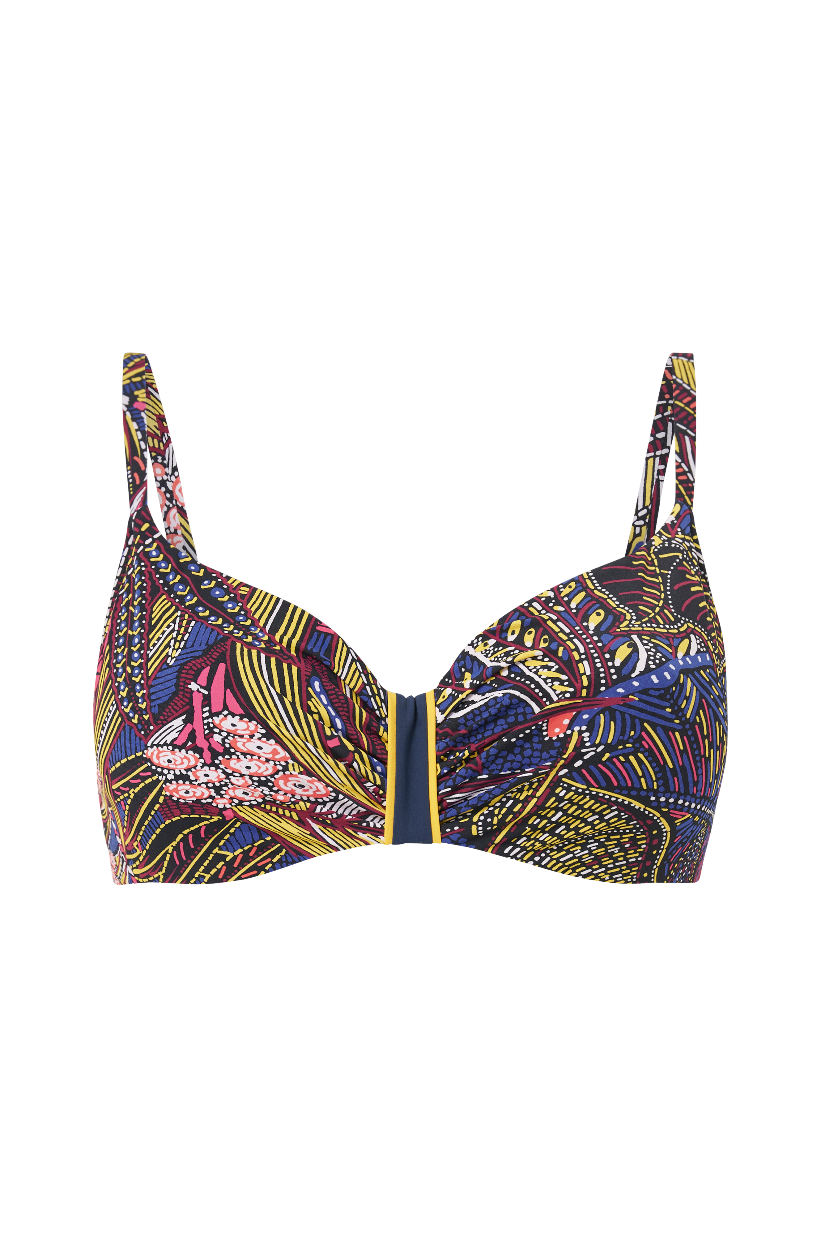 Bikini-bh med spile og dekkende cuper med meshfôr. Dekorativt bånd mellom cupene. Justerbare skulderbånd og plastspenne i ryggen.