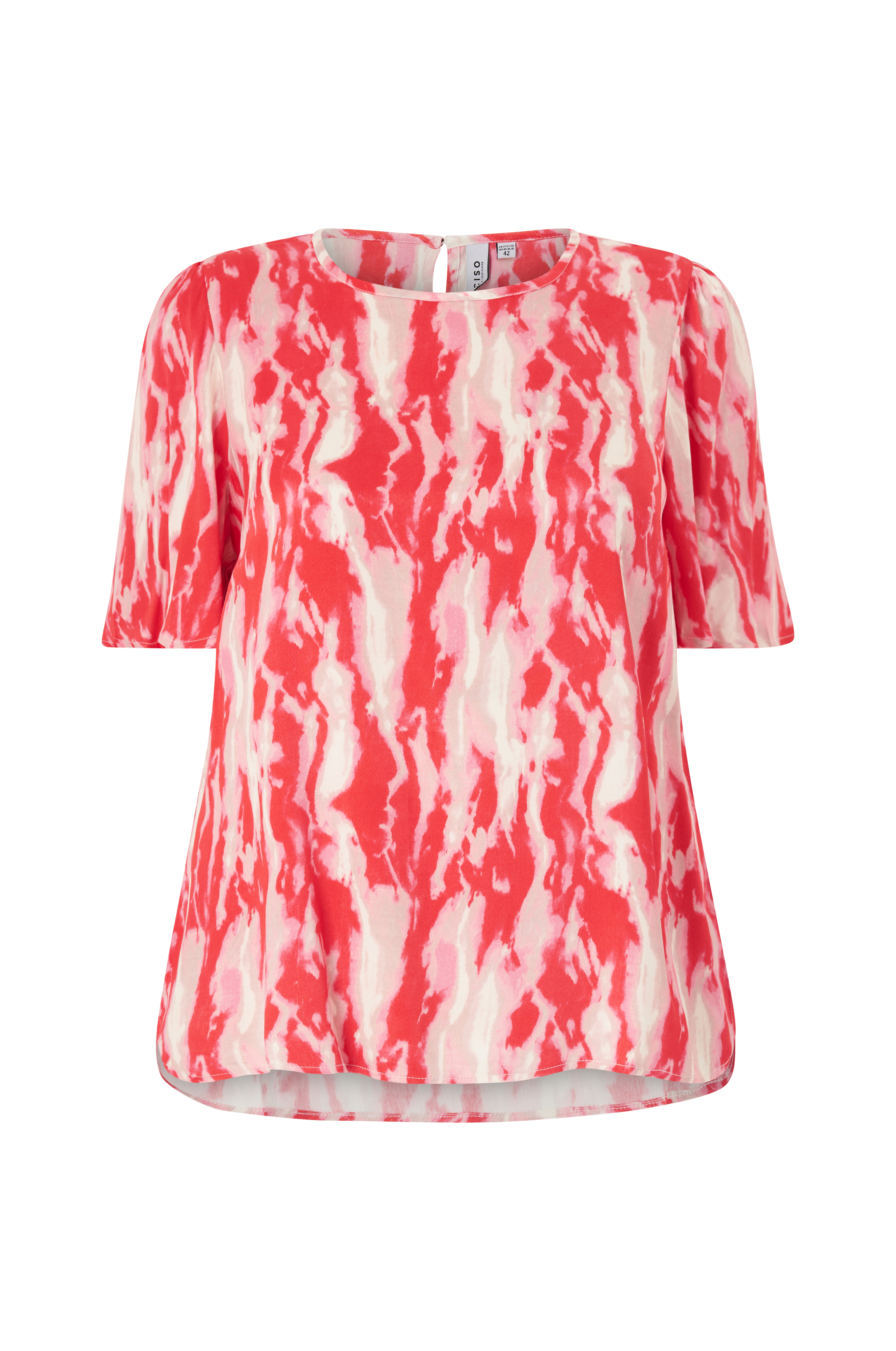 • Bluse i skinnende viskose med trykket mønster• Rund halsringning• Åpning oppover ryggen med knapp i nakken• Korte draperte volangermer• Plusstørrelser