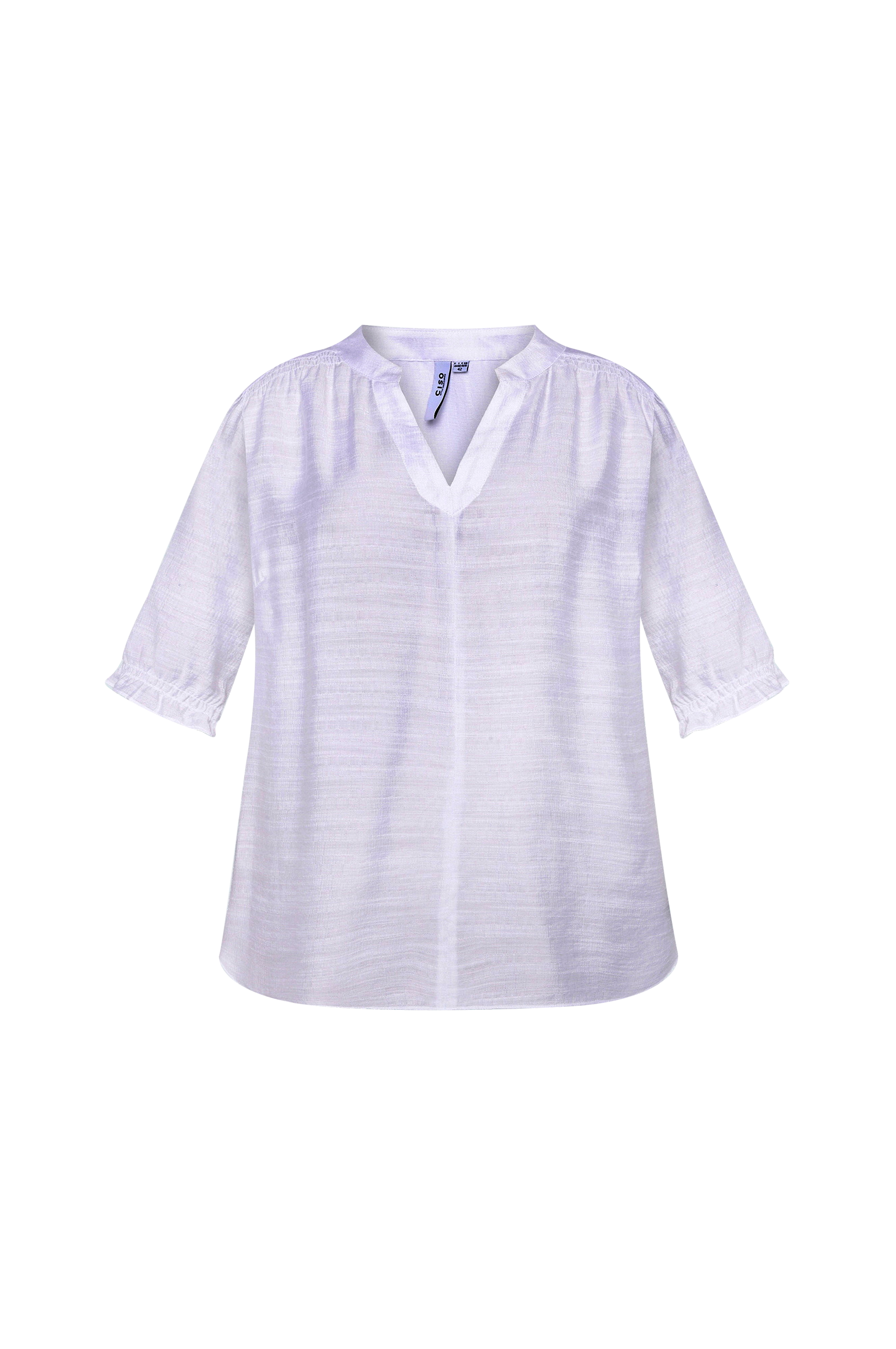 • Halvtransparent bluse med lett struktur• Rund hals med v-hals snitt foran• Smockdetalj på skuldrene• Kort pufferme med gummistrikk på bunnen• Avrundet hem
