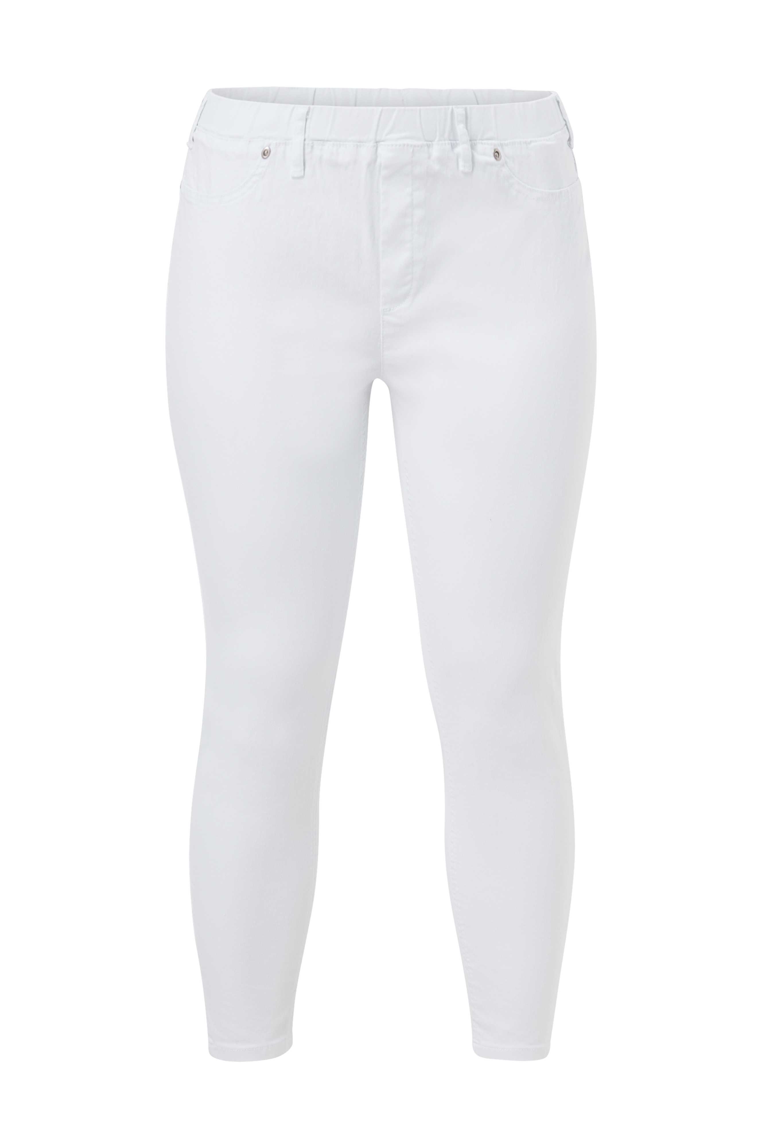 Figurnær modell i twill med fuskelommer med pyntesøm samt fuskegylf foran. Påsydd linning med innfelt strikk og hemper samt to påsydde baklommer. Liten splitt på utsiden av benkantene. Indre benlengde ca. 73 cm i str 44.