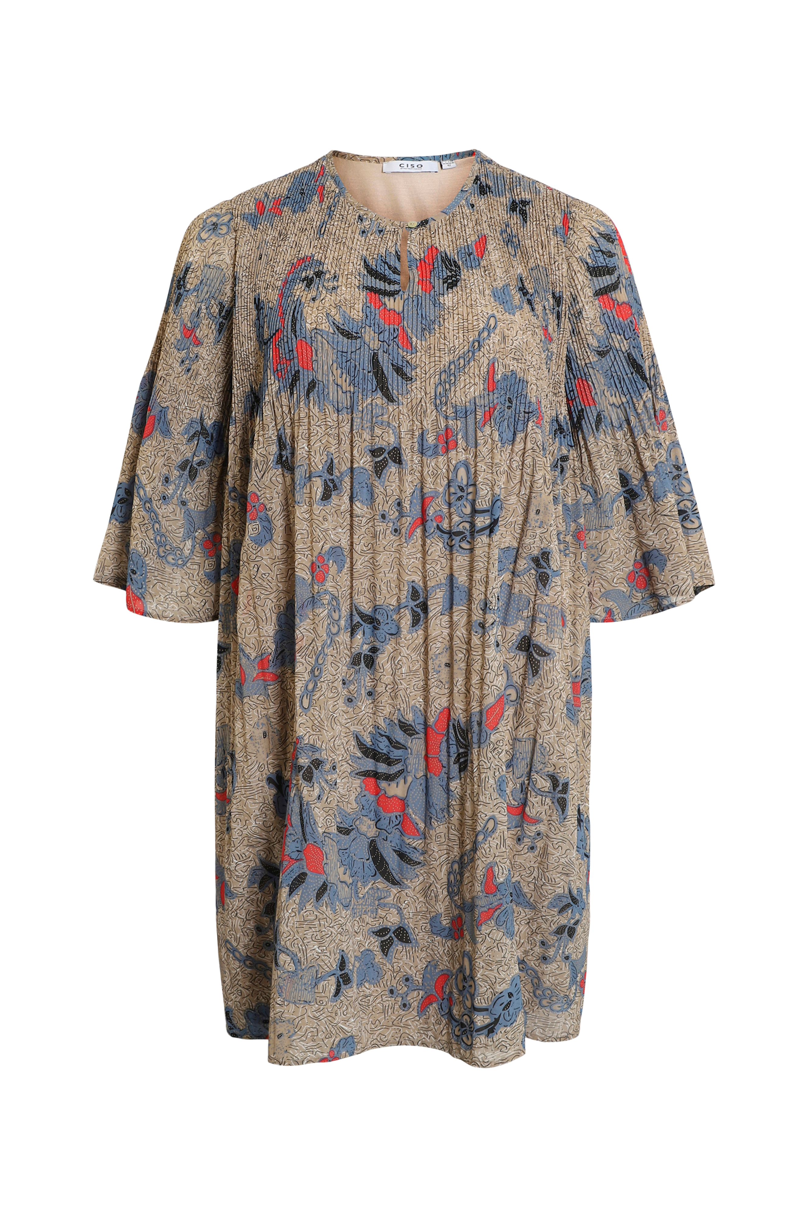 • Kort kjole• Rund hals med ventilasjon og knapp foran• Brede armer 3/4 lang• Plissé på toppen• Tynn kvalitet• Trikotfôr• Lengde: 96 cm i størrelse 44