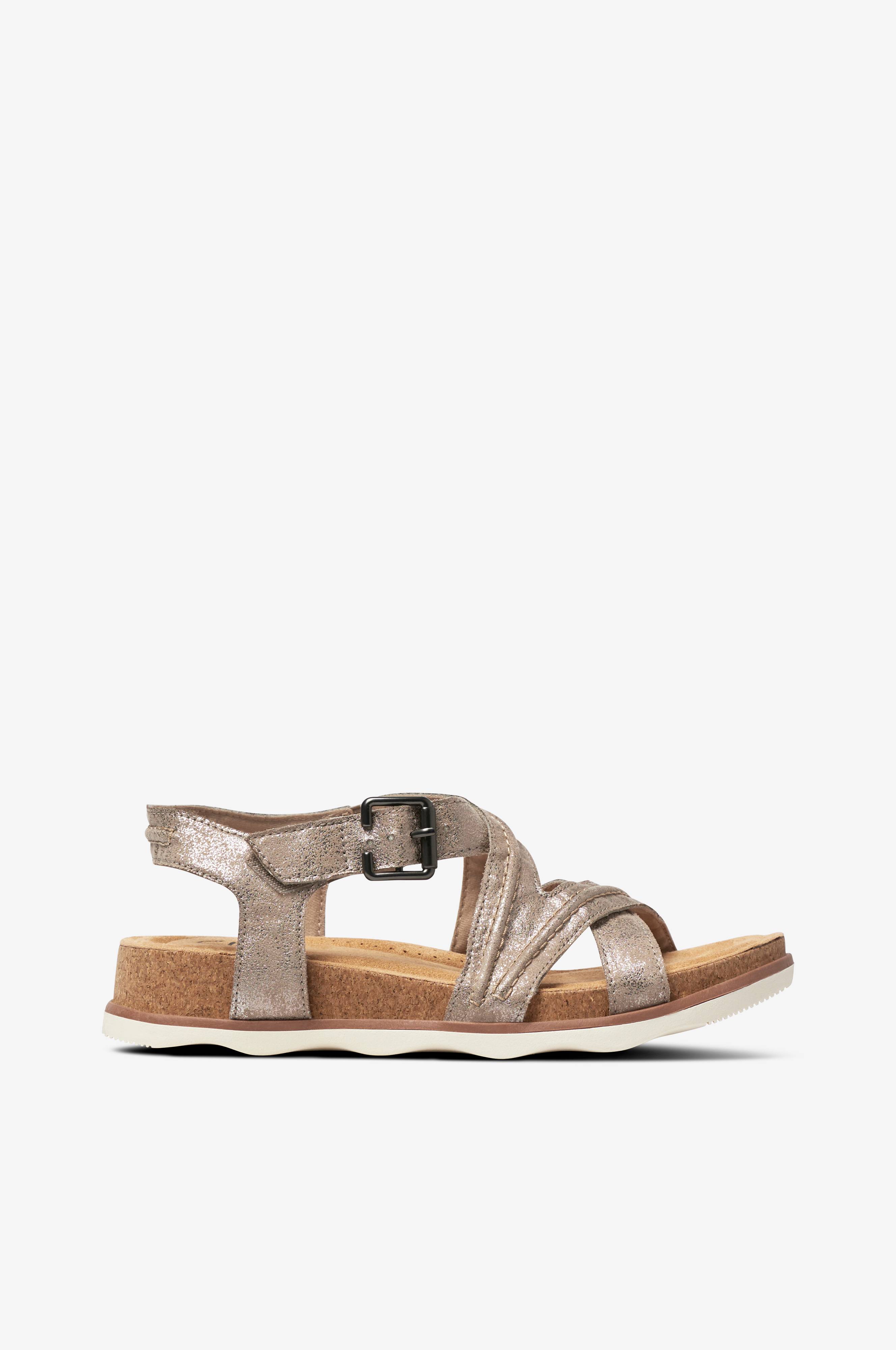 • Stropper i mykt, skimrende skinn med spenne i siden• Myk fotseng• Såle i kork