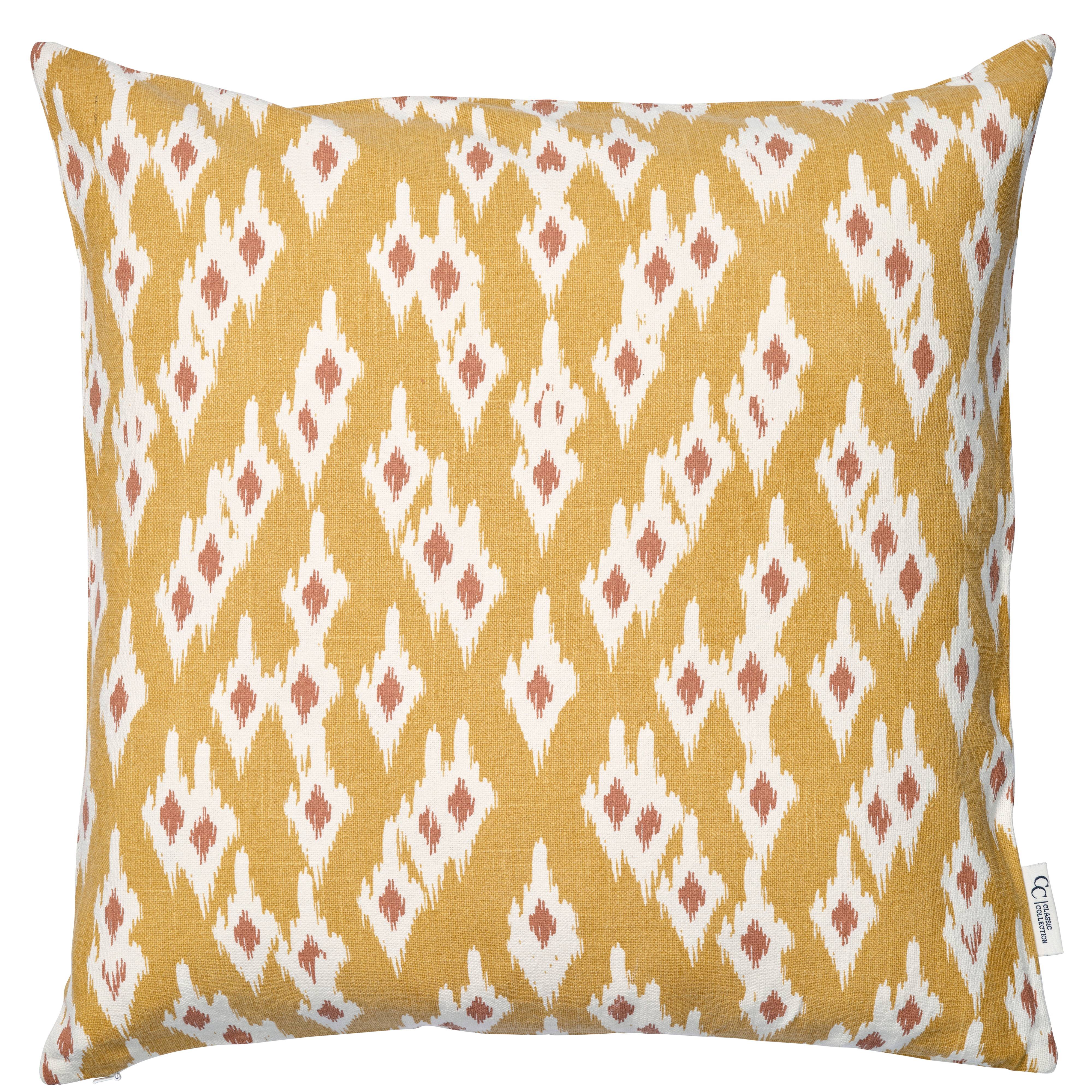 Ikat Diamond er et putetrekk i 100 % bomull med et stilisert diamantmønster i ikat. Det tettvevde, forvaskede stoffet har en myk, matt overflate og er behagelig å ta på. En skjult glidelås langs nederste kant gjør det enkelt å ta av trekket, samtidig som sømmene holdes diskrete. Baksiden er laget av samme stoff og mønster som forsiden, slik at puten ser like fin ut fra alle vinkler. Innvendig pute er ikke inkludert.