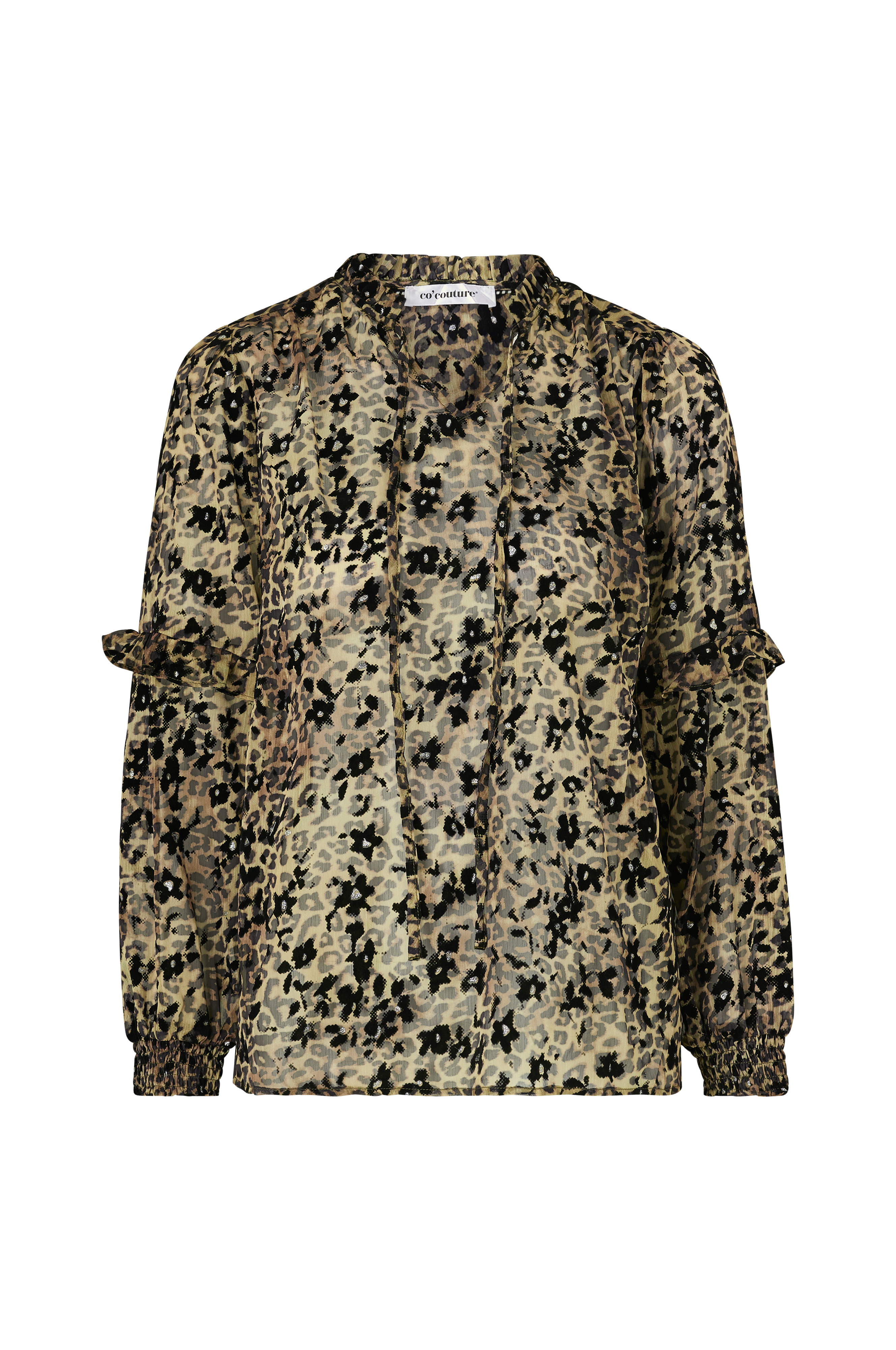 Bluse Gemma Frill Blouse fra Co'couture. Rett modell med ledig snitt og lange ermer med vaffelstrikk i ermekantene samt volang ved albuene. V-utringet hals med knyting foran og volangkant rundt nakken. Vevd chiffon med trykk i fløyel og glitter.