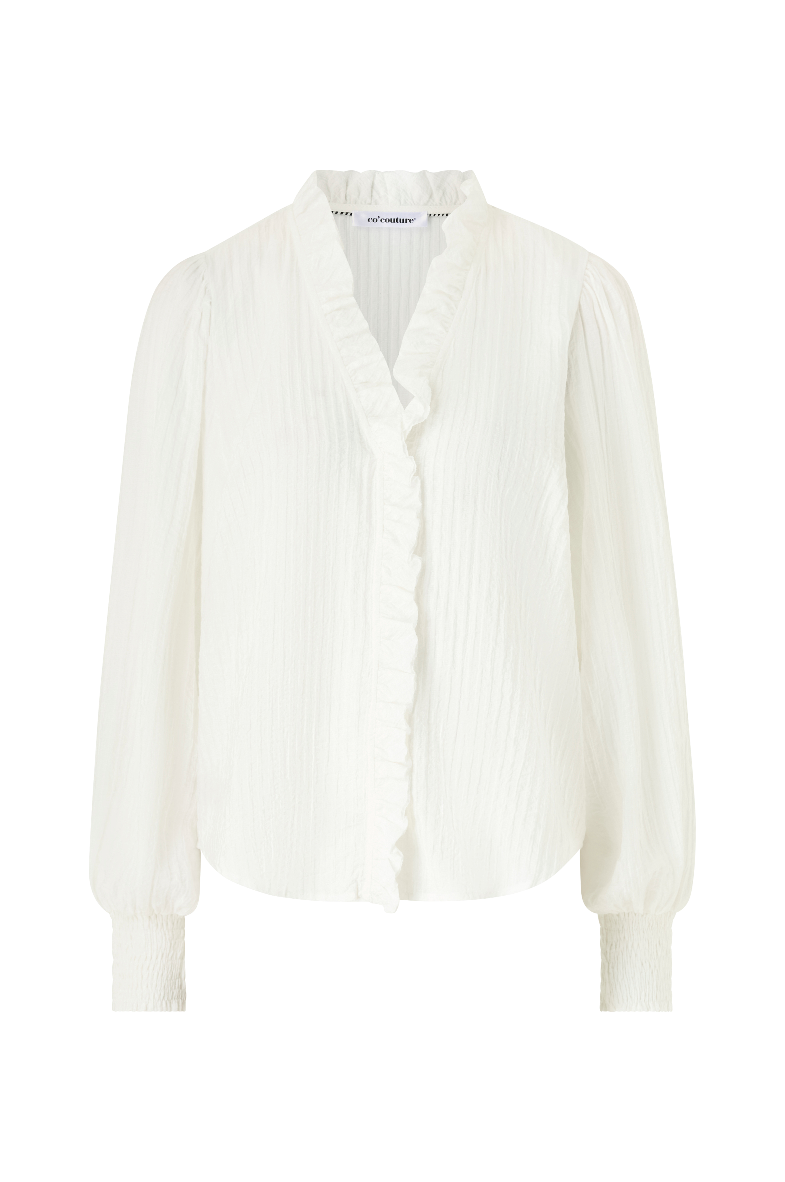 • Semitransparent bluse i viskosemiks med lett skrukket materiale• V-formet hals med volang rundt og foran• Skjult frontknepping foran• Langt ballongerme med vaffelsøm i ermeslutten