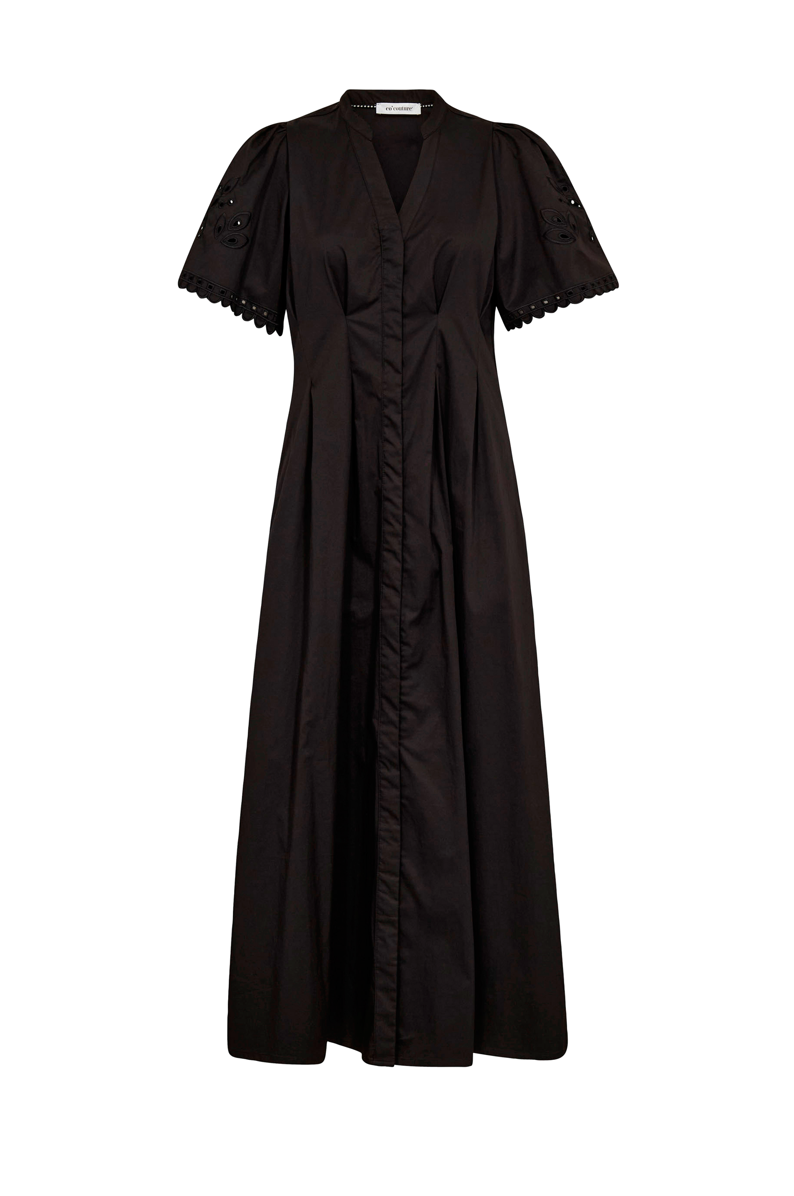 • Lang, utsvingt modell• V-hals snitt• Skjulte knapper foran• Korte, brede ermer med brodert hullmønster• Lommer i sidene• Motfold rundt midjen• Lengde: 130 cm i størrelse S