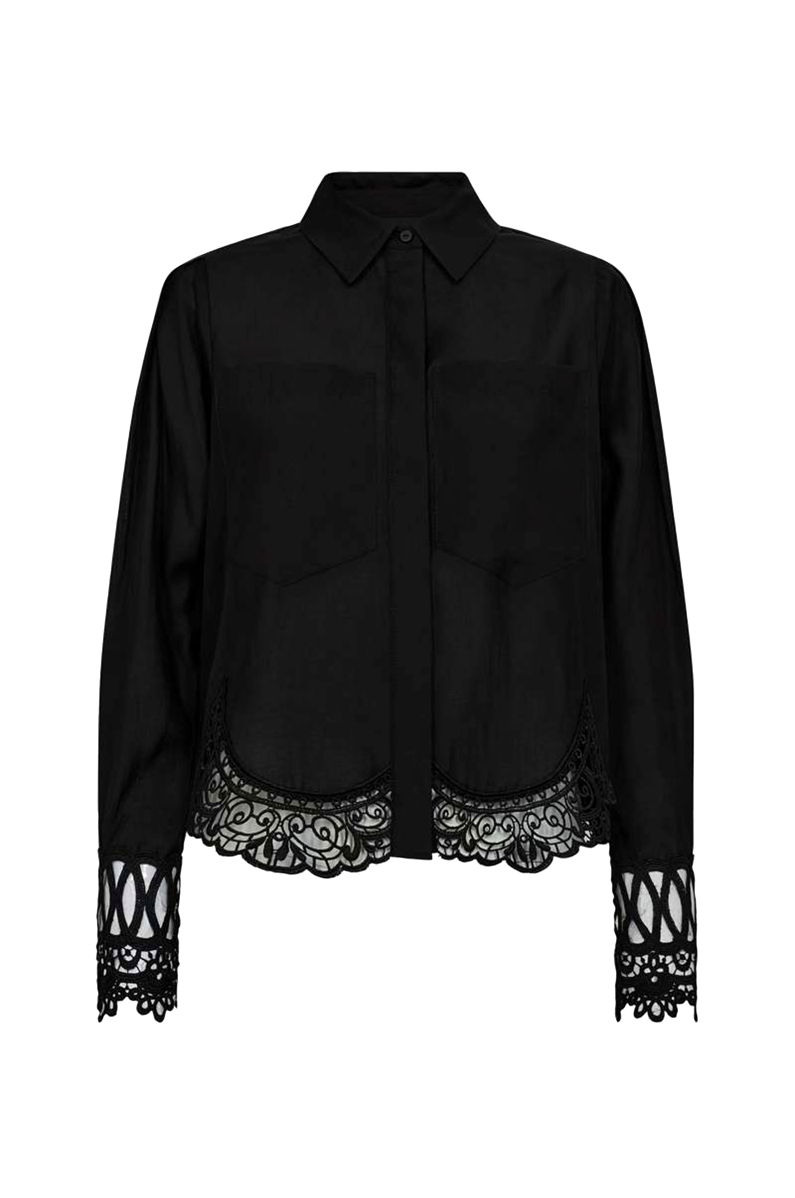 • Utsvingt, kort modell• Skjulte knapper hele veien fram• Åpne brystlommer• Langt erme med mansjett i blonde og plissé detalj på toppen• Hem i dekorativ blonde