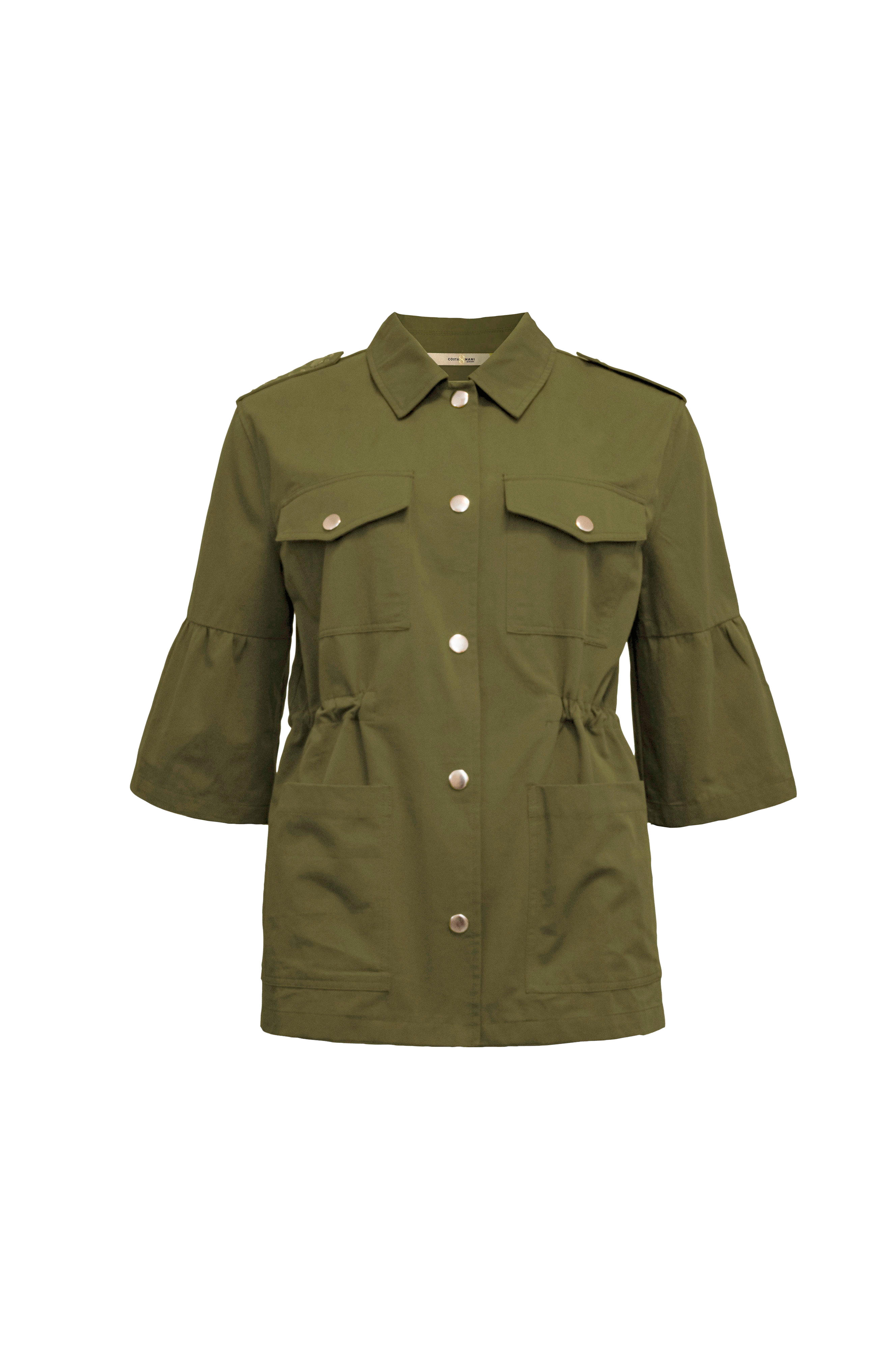 • Jakke med ermer 3/4 lang og utsvingte ermeender• Krage• Remmer på skuldrene med dekorative rhinstener• Knappelukking• Snøring ved midjen• Brystlommer med lokk• To åpne lommer• Lengde: 66 cm i størrelse S