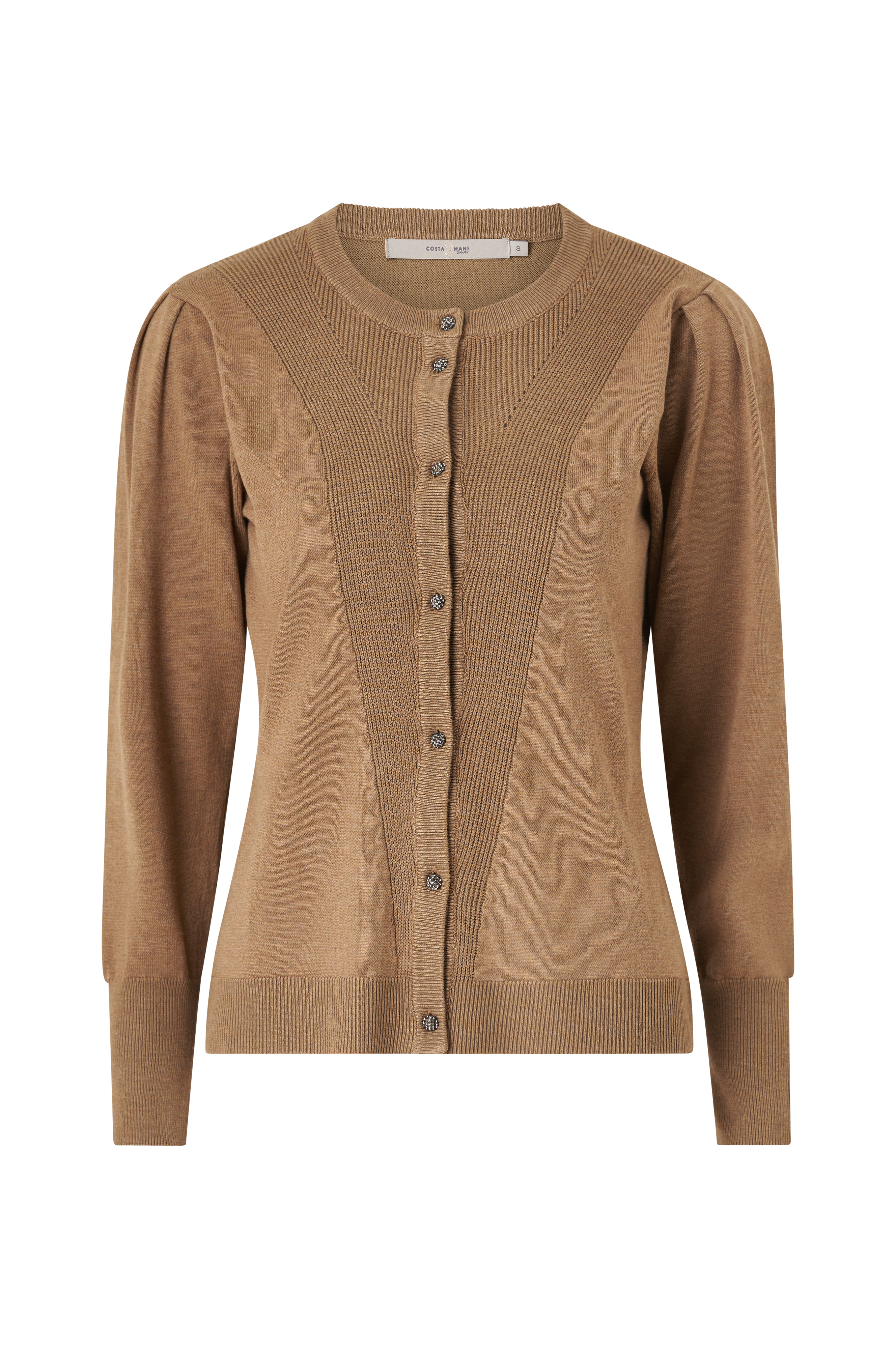 • Flatstrikket modell med dekorativ strikking• Rund hals med ribbet kant• Dekorative, glitrende knapper foran• Ribbestrikk i ermeslutten og på bunnen