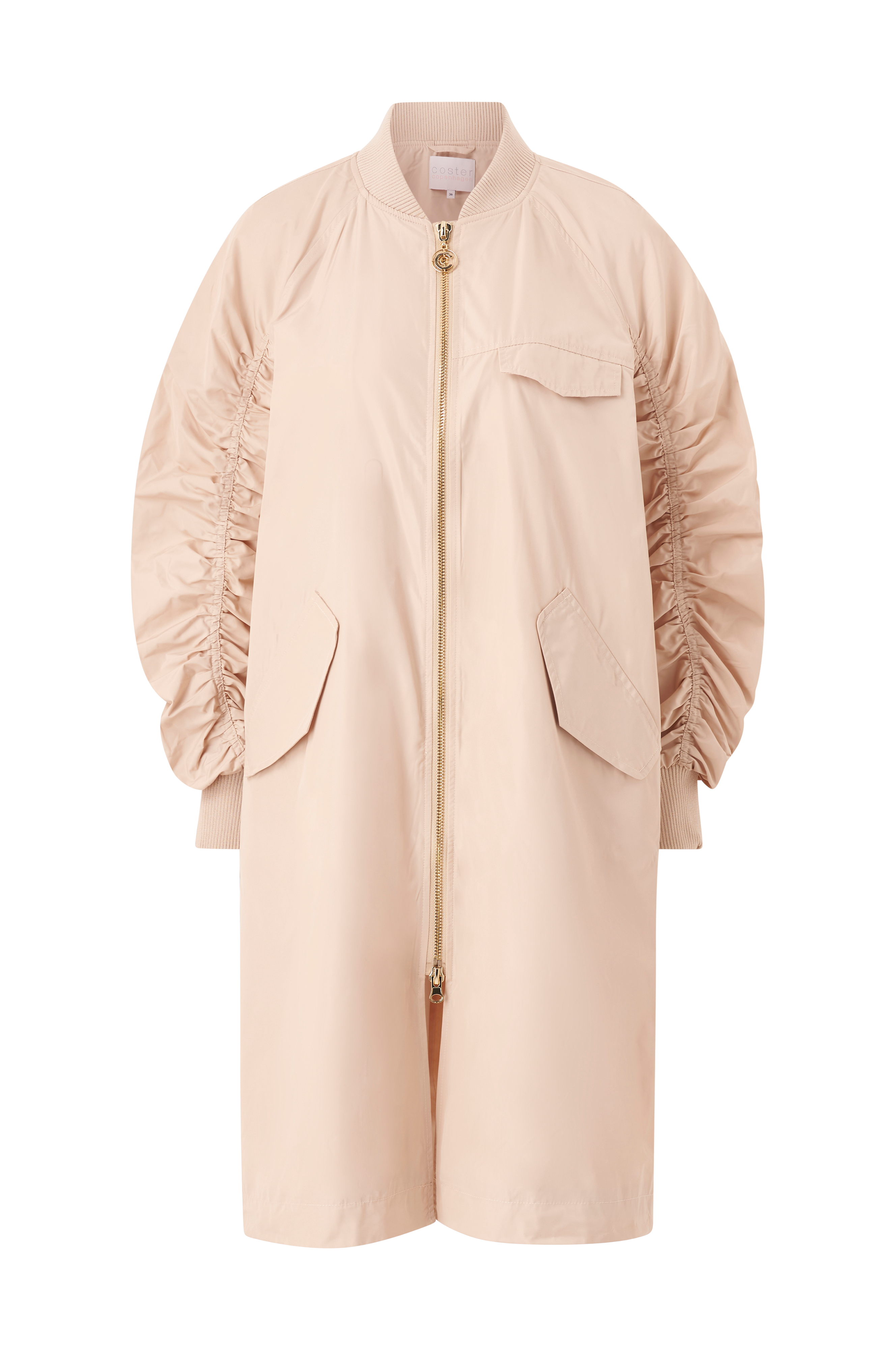 Lang jakke med løs passform. Ribbestrikket krage og toveisglidelås. To lommer nederst og en brystlomme. Rynkede sømmer langs ermene. Vrangbord i ermekantene. Lengde 108 cm i str 36.