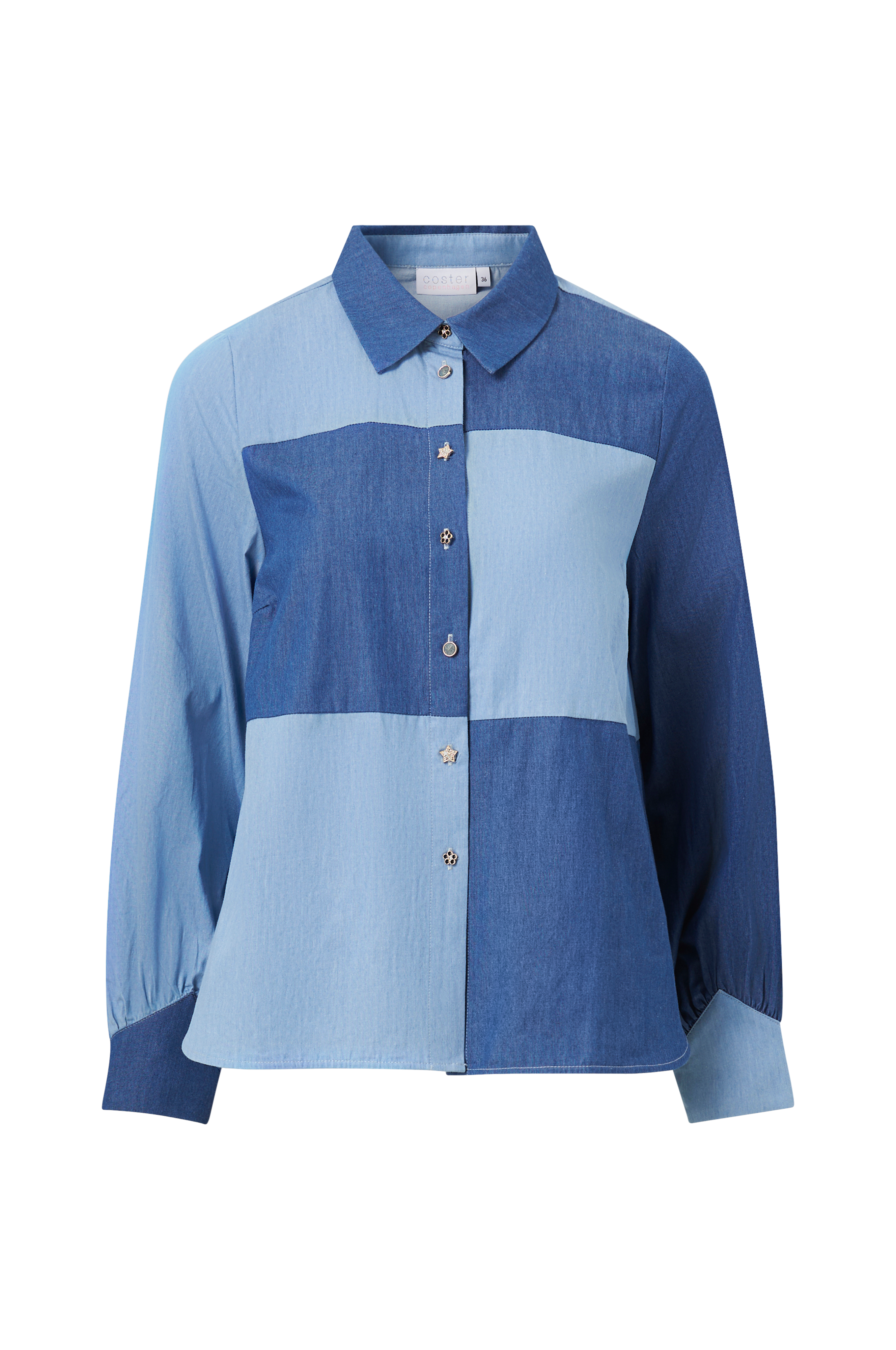Skjorte i to nyanser av denim. Ulike knapper med steiner foran. Lange ermer med mansjett.