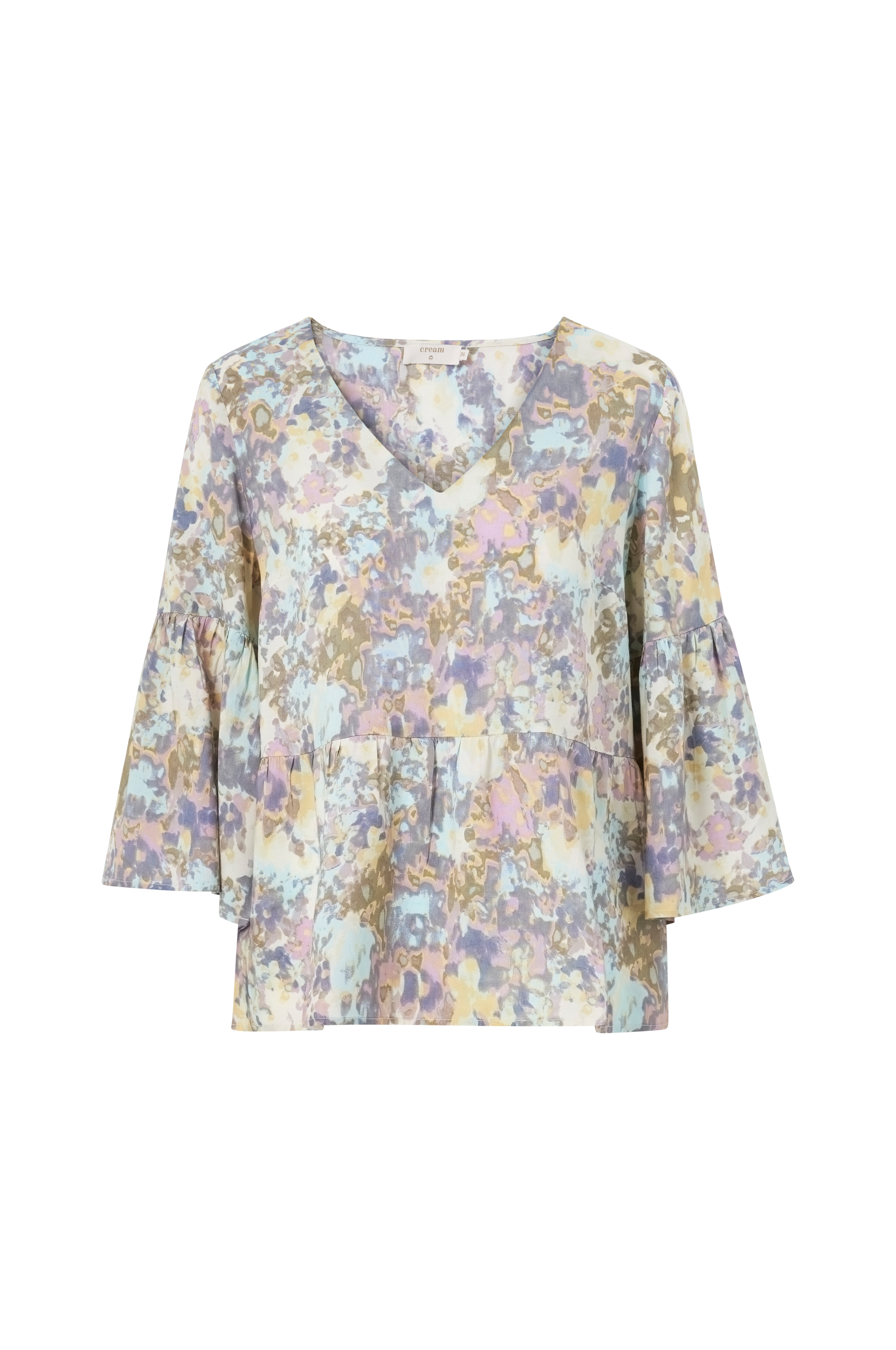 Oversizemodell i vevd, mønstrete sateng med avskjæring i midjen og vidde nederst. V-utringet hals og vide, 3/4-lange ermer med avskjæring og rynker ved albuen.