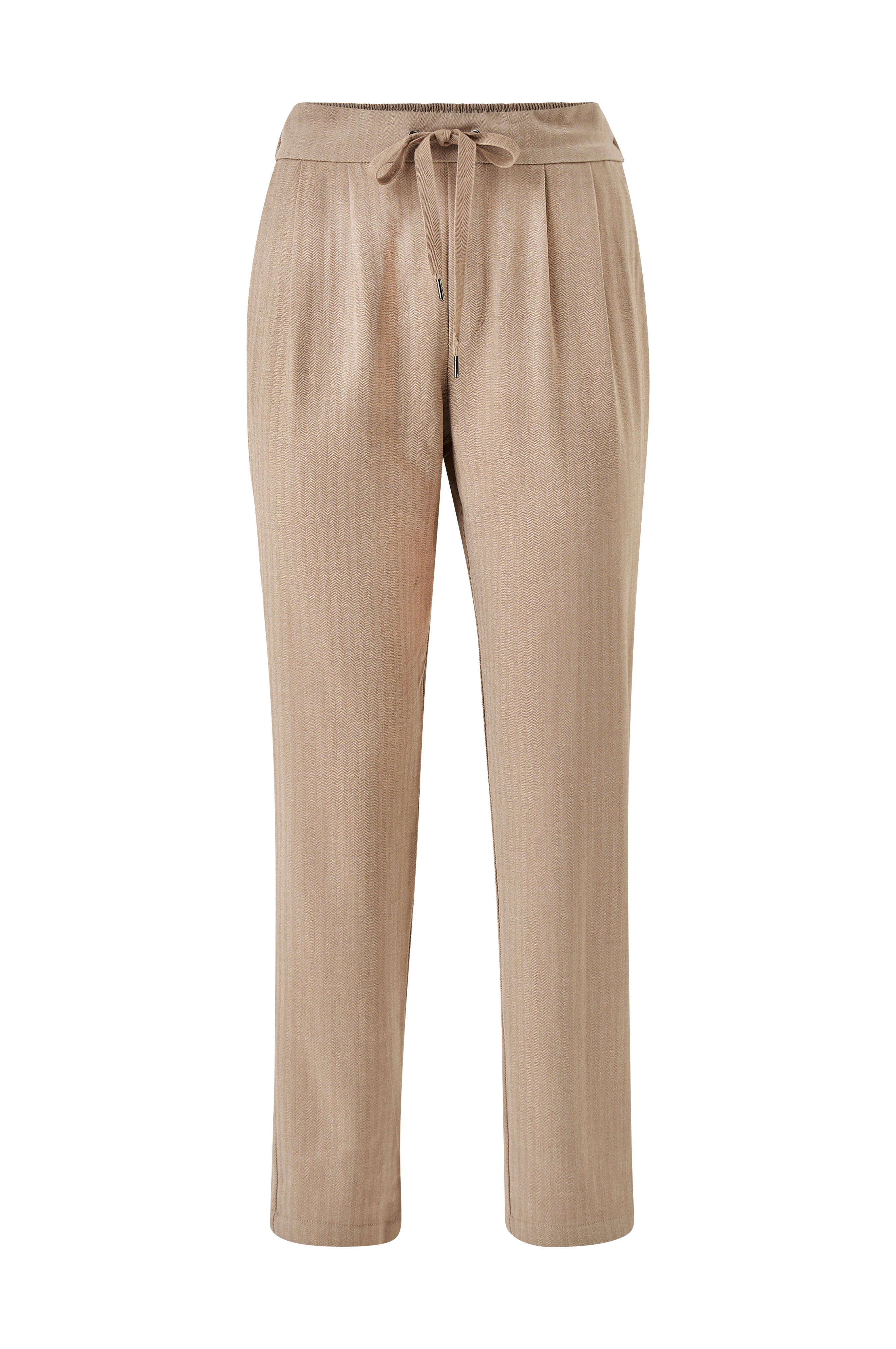 Bukse LannaCR Pants fra Cream. Modell med vidde i lårene og lett avsmalnende benkanter. Påsydd linning som er glatt foran og har snøring samt innfelt strikk bak. Lagte legg foran og to skrålommer foran samt to innfelte fuskelommer bak. Kvalitet med innvevd fiskebensmønster. Indre benlengde ca. 71 cm i str 36.