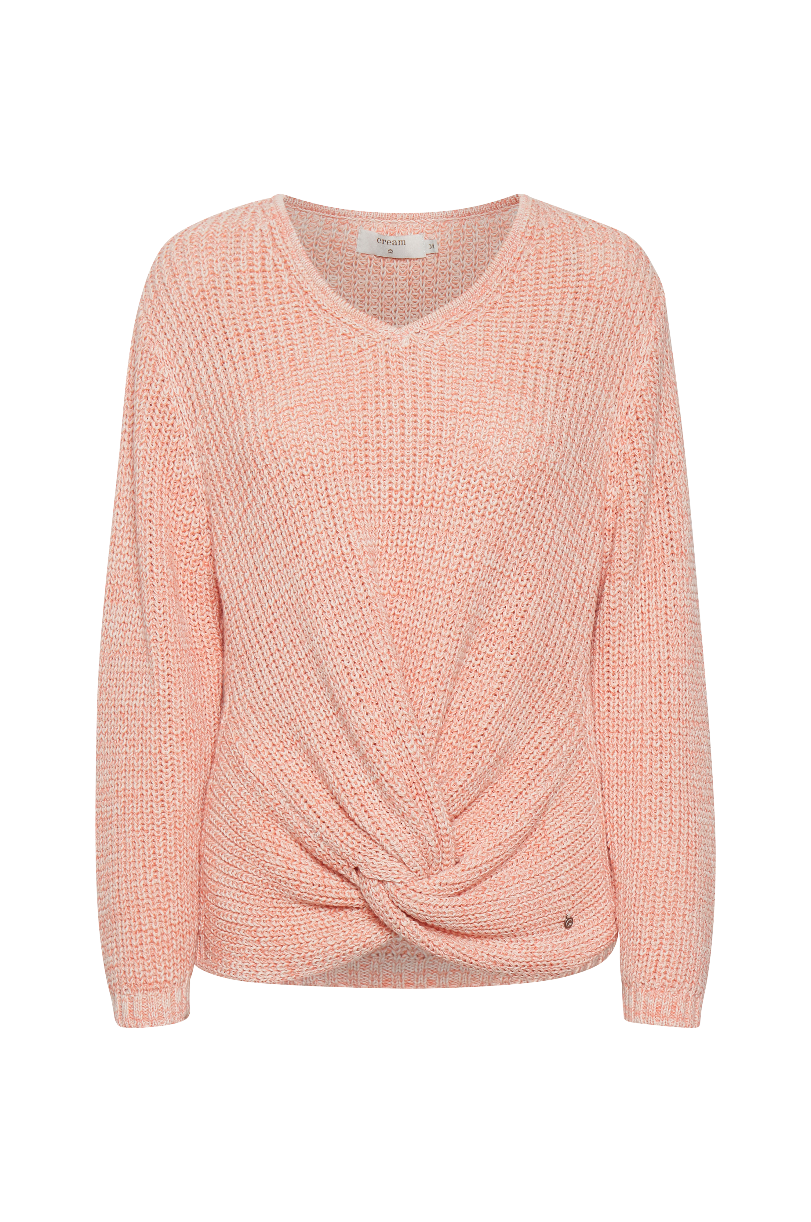 Strikket genser med knutedrapering nederst. V-utringning med smal ribb foran.