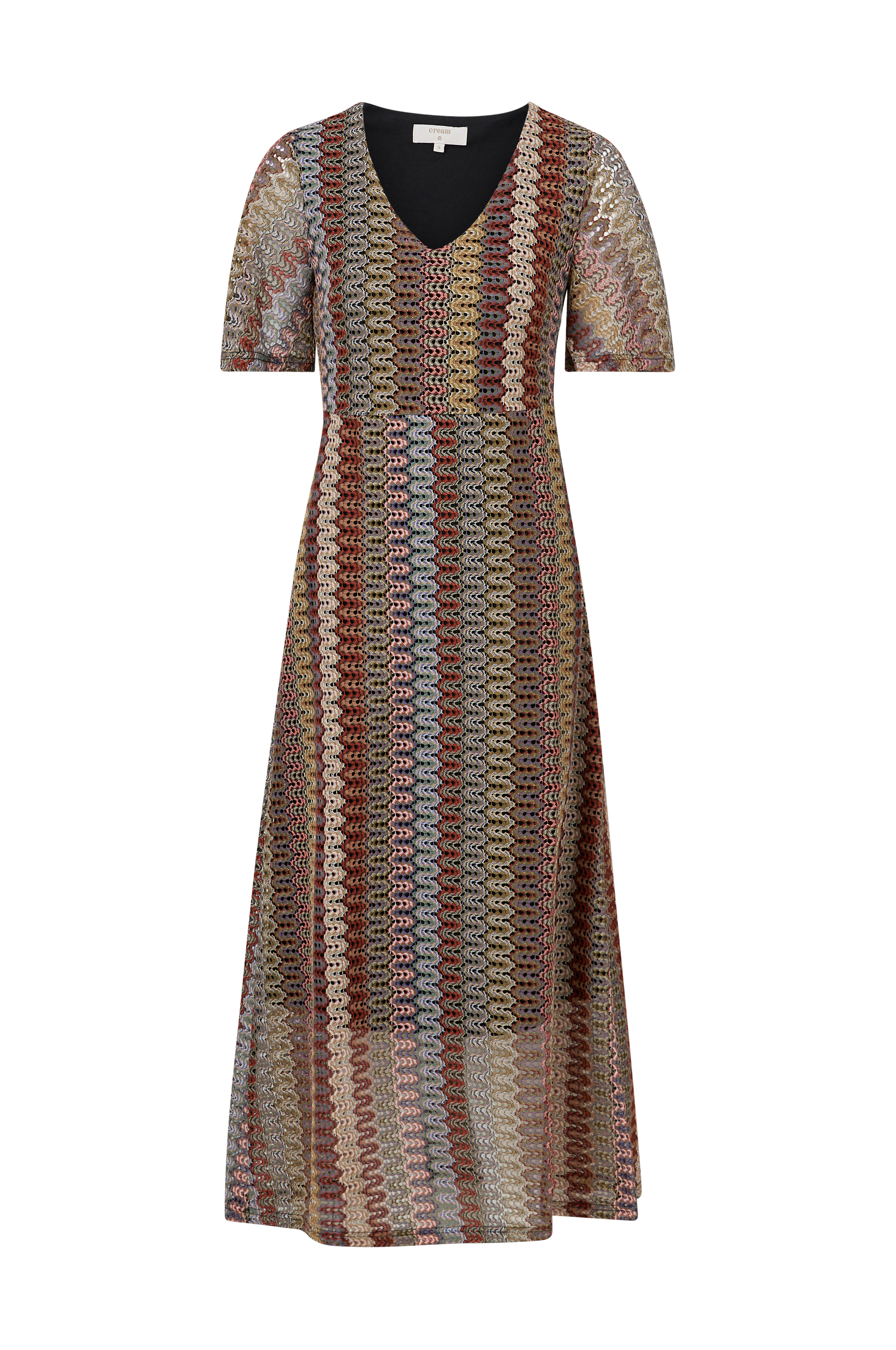 Maxikjole crFie Dress fra Cream. Figurformet modell i gjennombrutt, flerfarget blonde med avskjæring i midjen og vidde i skjørtet. Korte ermer og V-utringet hals samt mykt fôr i trikot. Lengde ca. 134 cm i str S.
