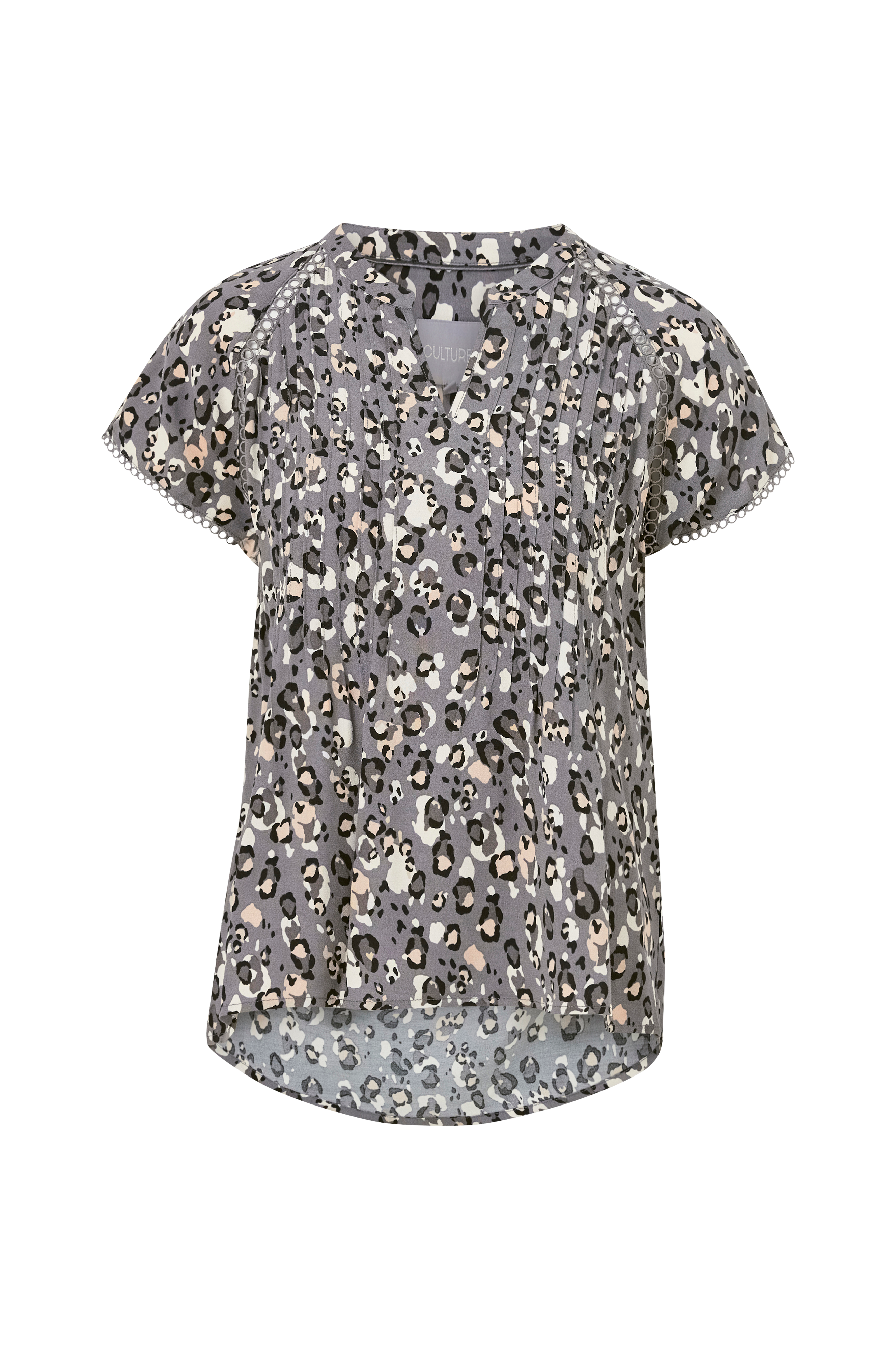Bluse cuJosa Capsleeve fra Culture i vevd, leopardmønstret viskose med kreppet struktur. V-splitt og sydde legg foran. Korte ermer med dekorativt kantebånd. Blusen er lengre bak.