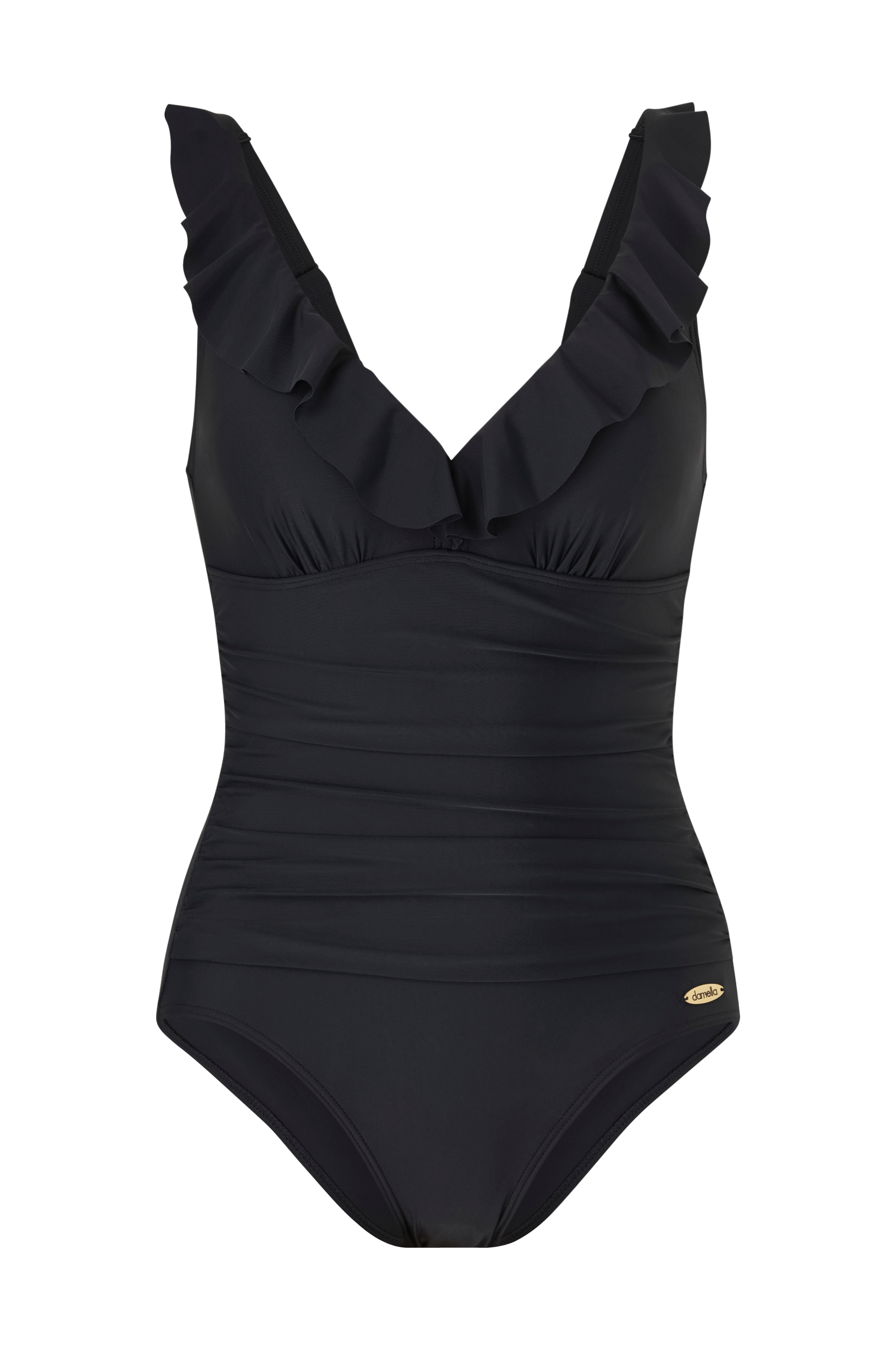 • Modell med samlet drapering foran• Volang i halsen og over skuldrene• Formpressede, lett polstrede kopper• Brede, justerbare skulderstropper• Fôret skritt