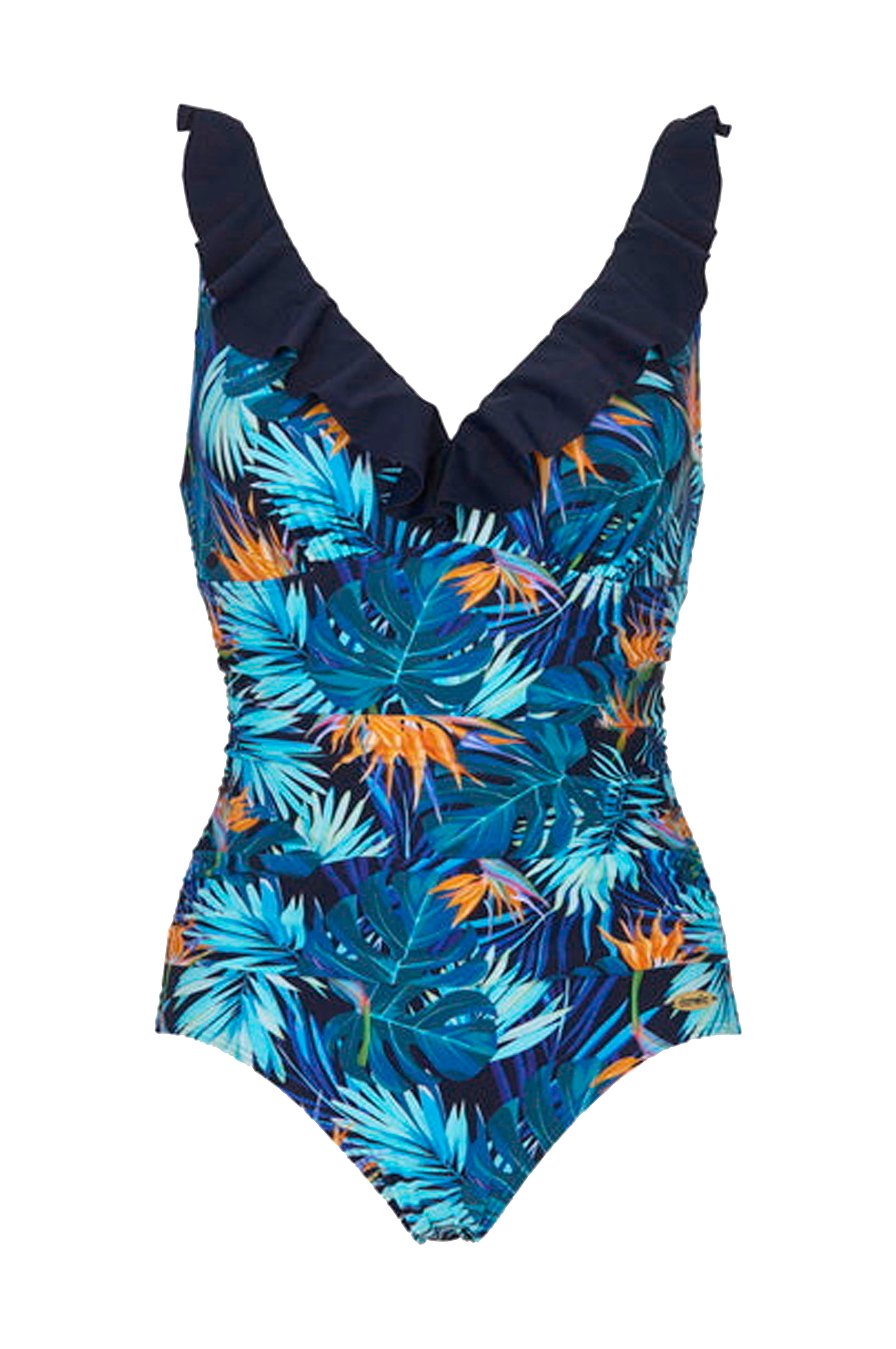• Modell med samlet drapering• Volang i halsen og over skuldrene• Formpressede, lett polstrede kopper• Brede, justerbare skulderstropper• Fôret skritt