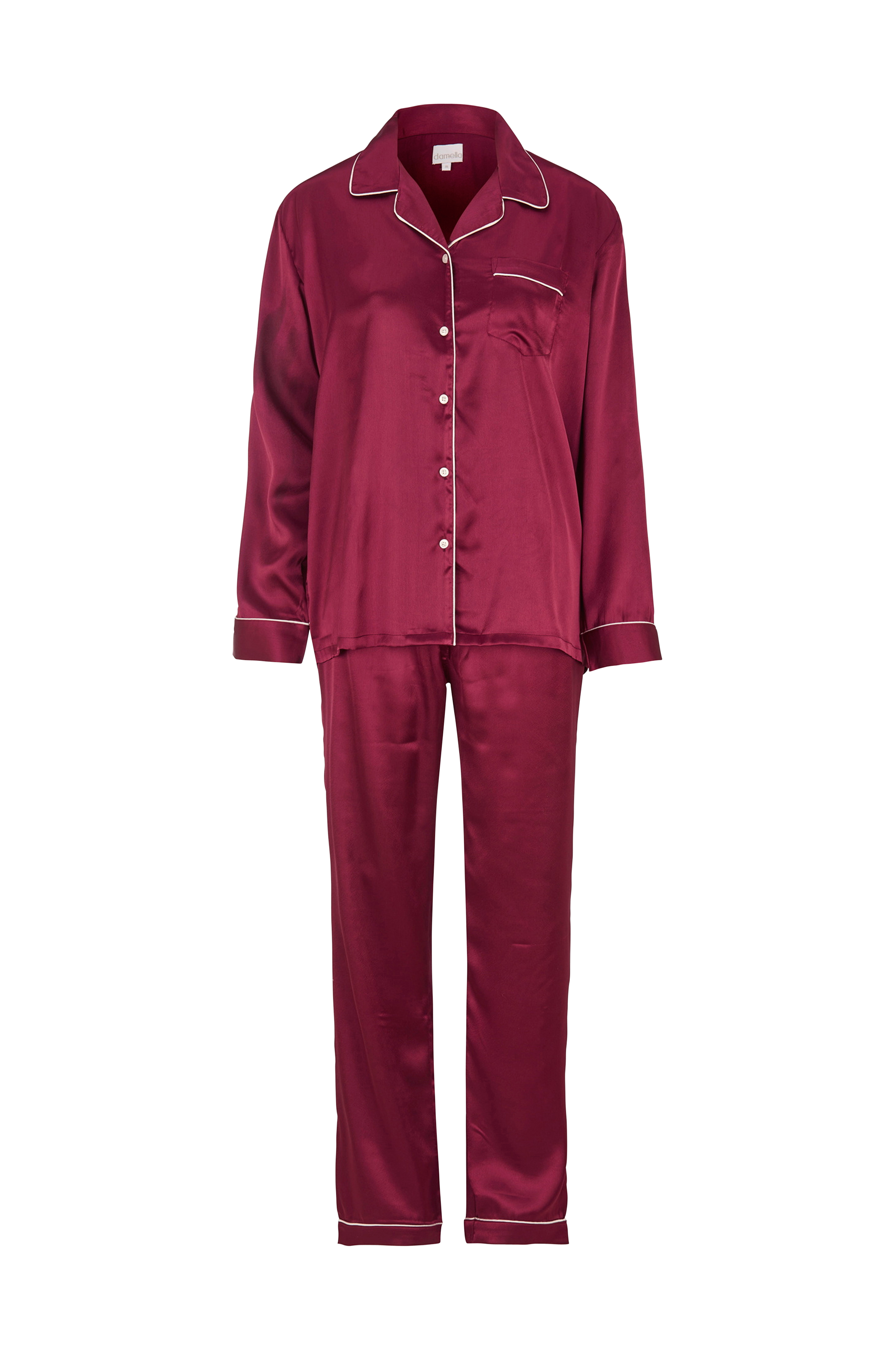 • Sett i sateng med matchende kantbånd• Jakke med krage og jakkeslag• Knapper foran• Brystlomme• Bukser med elastisk midjebånd og rette bein• Sidelommer