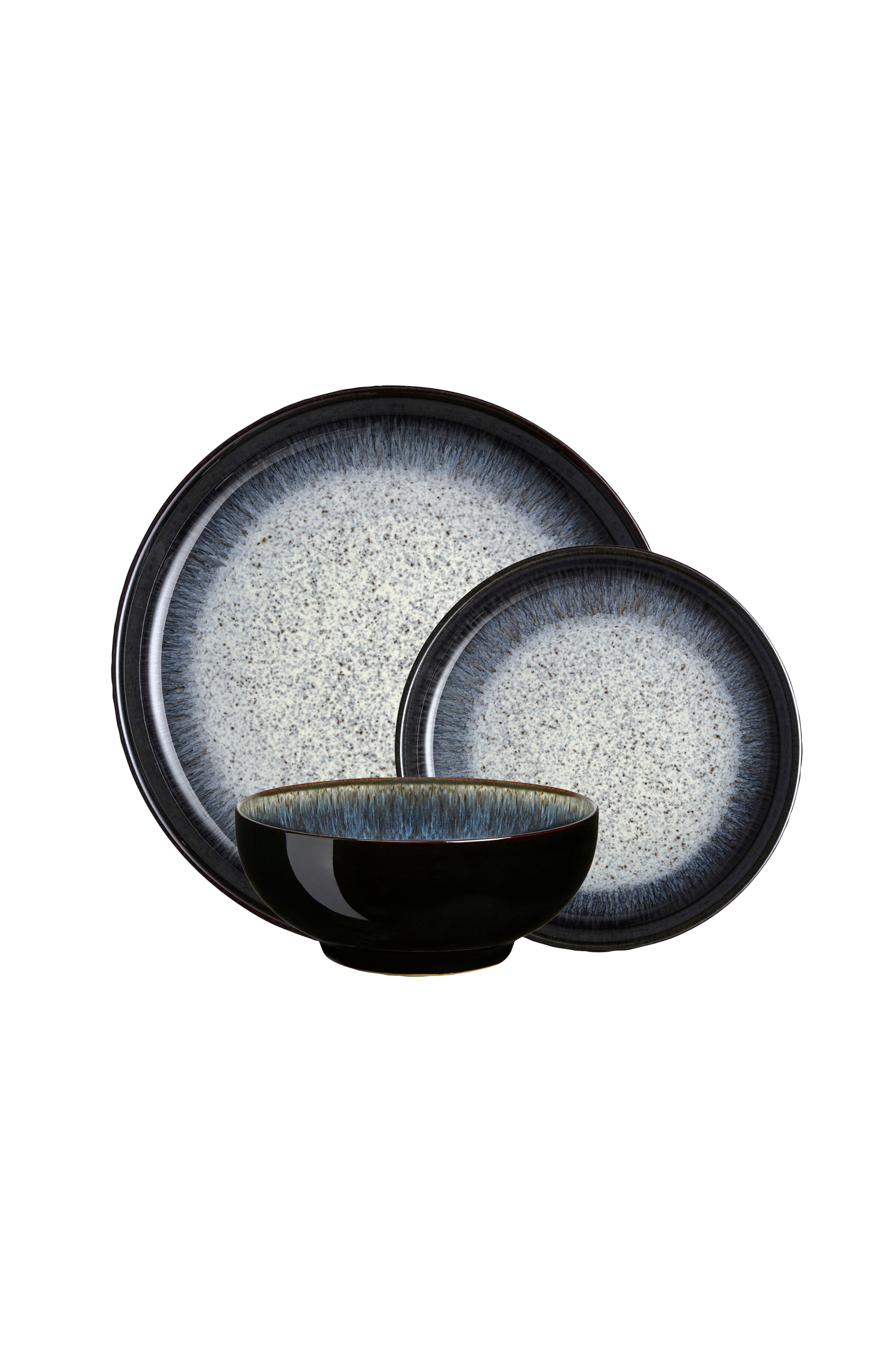 Sett med 12 deler i serien Halo fra Denby. Coupeformen på disse tallerkenene gir deg dybde og de litt høye kantene gjør tallerkenene fine å servere retter med saus i. Den håndlagde skålen er perfekt til grøt, suppe og desserter. Halo er kjent for sin distinkte glasur som gir serien et effektfull utseende.