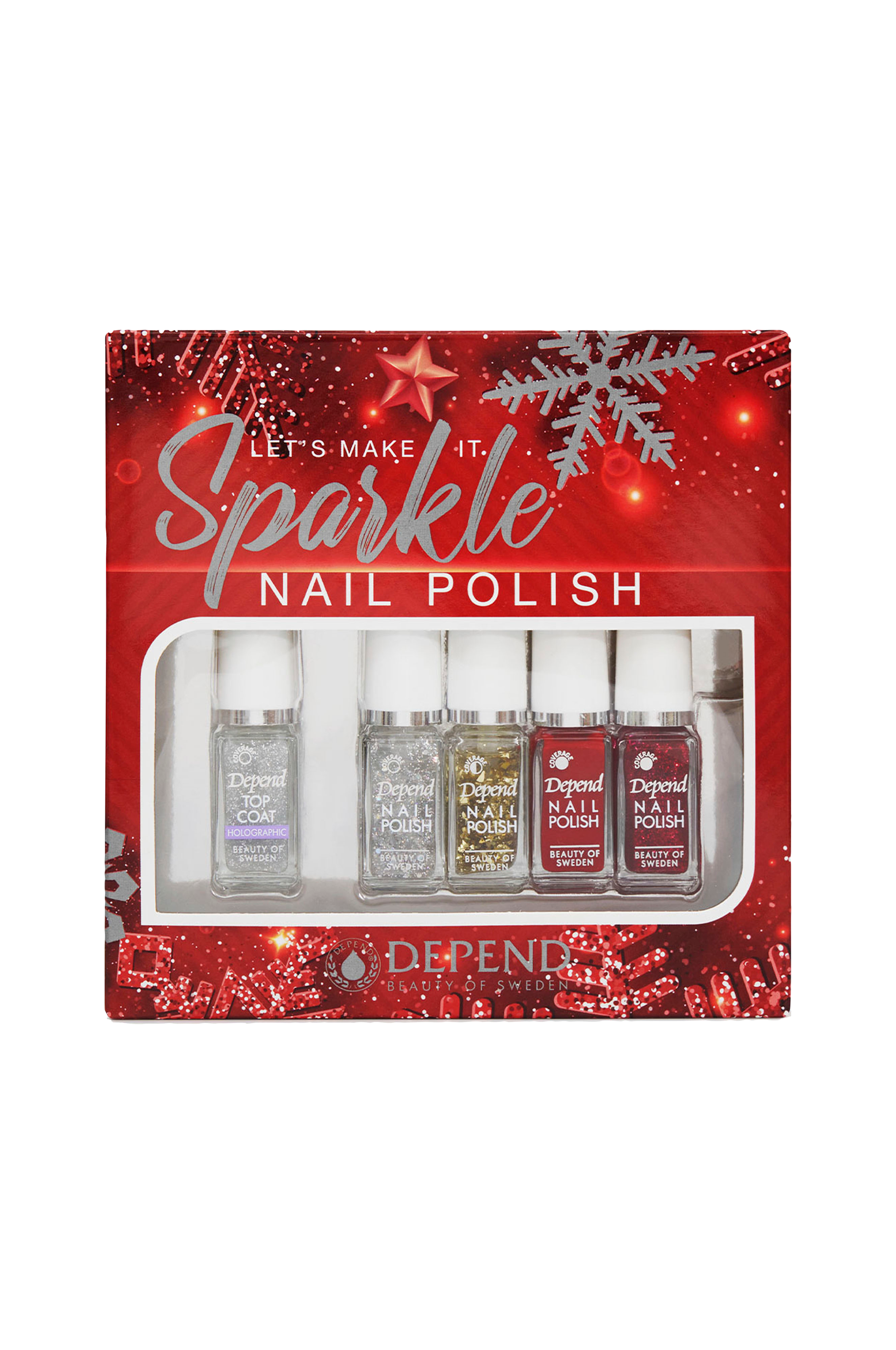 Det perfekte gavesettet med minilakk i festlig julestil: rød, sølv, gull og glitter. Inneholder også en holografisk topplakk som gir manikyren en effektfull finish.