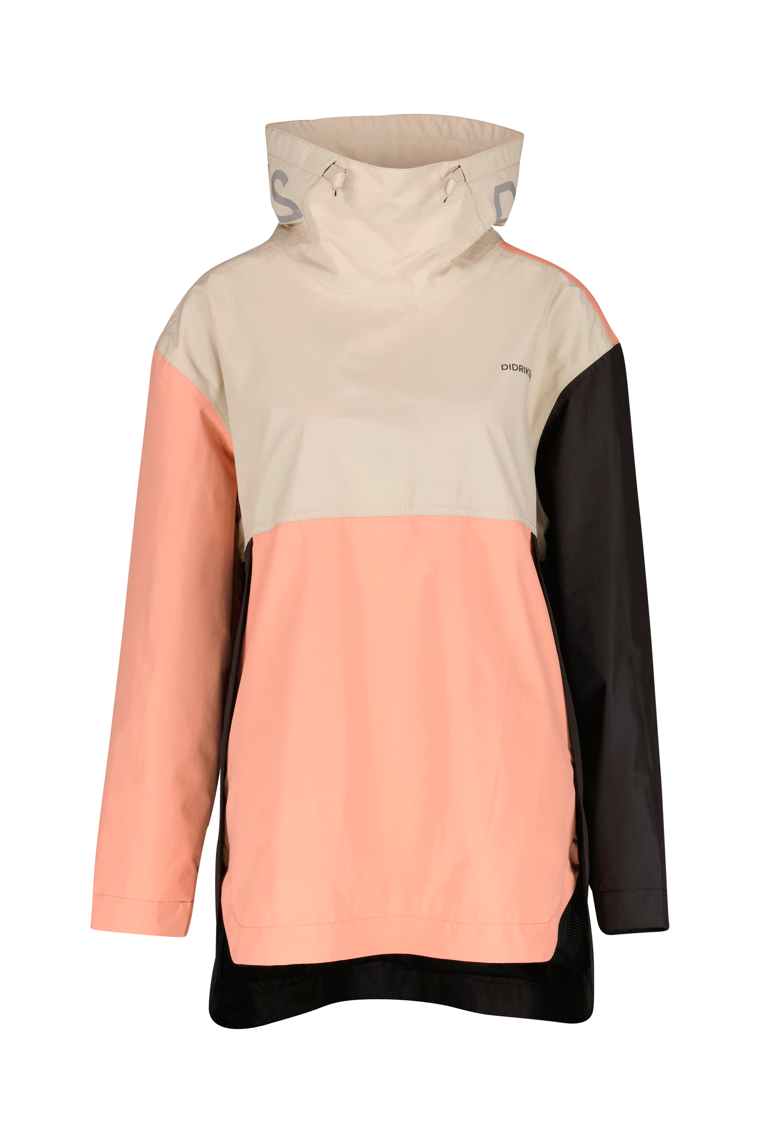 Anorakk helt uten knapper, glidelåser eller andre detaljer. Fremstilt av et mykt, lett ripstop-stoff med matt overflate. Høy krage med snor. En stor refleks pryder kragens bakside. To lommer foran. Reflekstrykk på brystet og skulderen. Jakken er 100% vind- og vanntett med teipede sømmer for en helt vanntett konstruksjon. Vannavvisningen er uten PFC. Lengde ca. 81 cm i str 36.