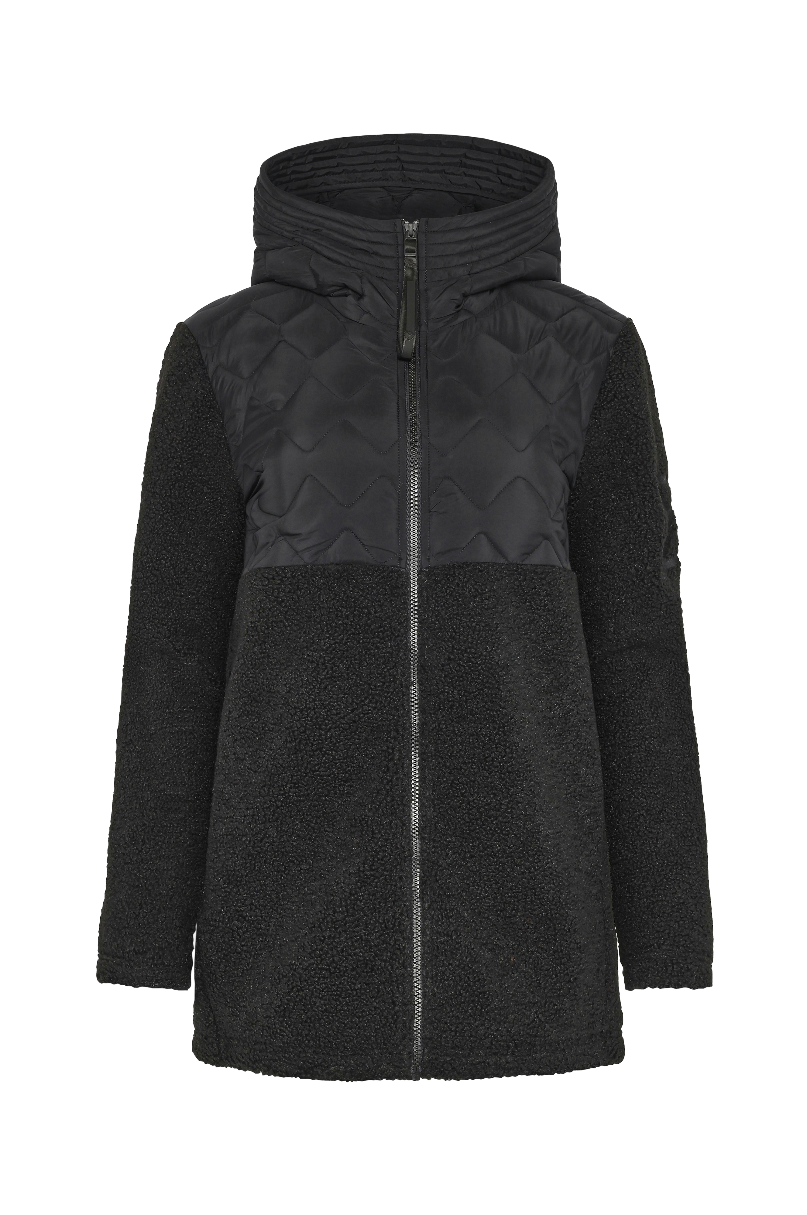 • Jakke i teddy med vatterte partier • Vannavstøtende, varmende materiale • Fast hette • Glidelåslukking • Fleece-fôr • Sidelommer • Løs passform • Lengde: 79 cm i størrelse 36