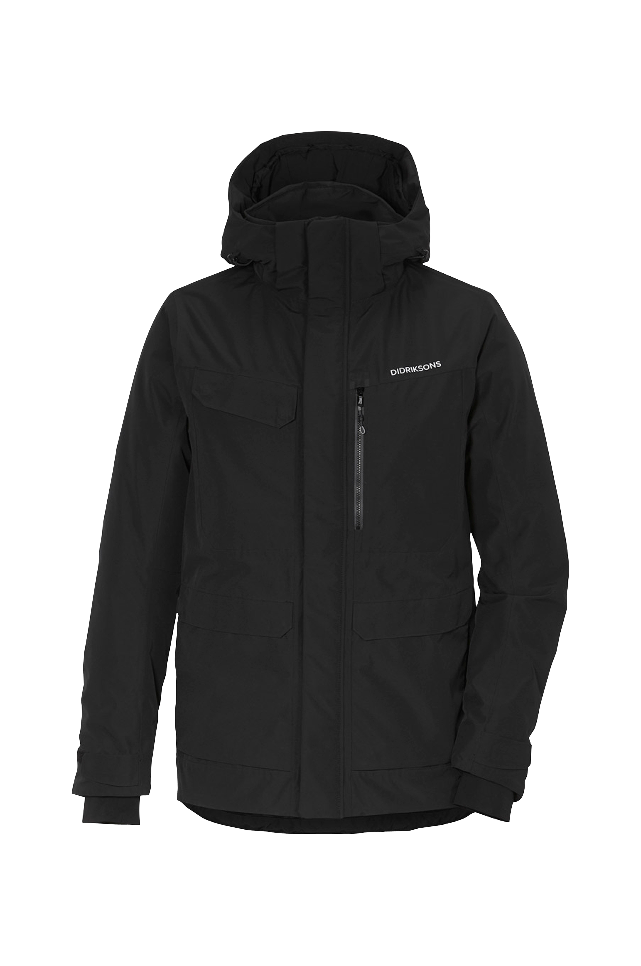 Vattert, helt vind- og vanntett jakke med teipede sømmer. Den passer like fint å bruke i byen som på landet. Normal, rett passform. Produsert i et mykt polyestermateriale med glatt, matt overflate. Teipede svarte refleksdetaljer rundt den vatterte, justerbare og avtagbare hetten. Toveisglidelås med beskyttende vindstolpe langs hele fronten. Logo i reflekstrykk på brystet samt bak på den ene skulderen, også refleks i glidelåsens glider. Foran er det fire lommer, hvorav to som kan brukes fra to sider. Den ene lommen lukkes med en vannavvisende glidelås og de andre lommene har knappelukking. Innerlomme med glidelås samt to innerlommer i mesh. Jakken justeres med snøring i nederkant. Justerbare ermekanter. Ermekanten har elastisk vrangbord med tommelhull. Lengde ca. 80 cm i str M.