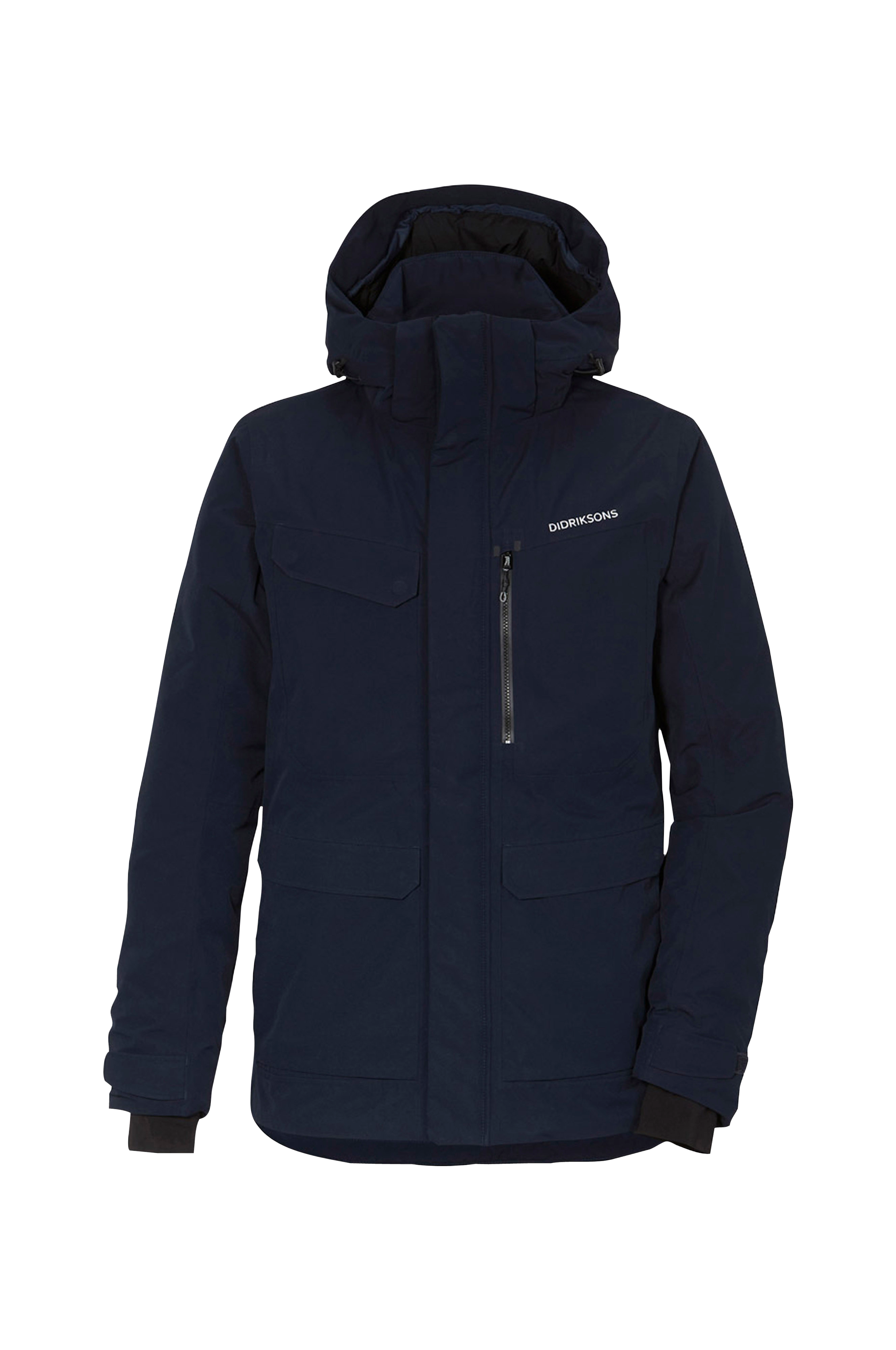 Vattert, helt vind- og vanntett jakke med teipede sømmer. Den passer like fint å bruke i byen som på landet. Normal, rett passform. Produsert i et mykt polyestermateriale med glatt, matt overflate. Teipede svarte refleksdetaljer rundt den vatterte, justerbare og avtagbare hetten. Toveisglidelås med beskyttende vindstolpe langs hele fronten. Logo i reflekstrykk på brystet samt bak på den ene skulderen, også refleks i glidelåsens glider. Foran er det fire lommer, hvorav to som kan brukes fra to sider. Den ene lommen lukkes med en vannavvisende glidelås og de andre lommene har knappelukking. Innerlomme med glidelås samt to innerlommer i mesh. Jakken justeres med snøring i nederkant. Justerbare ermekanter. Ermekanten har elastisk vrangbord med tommelhull. Lengde ca. 80 cm i str M.