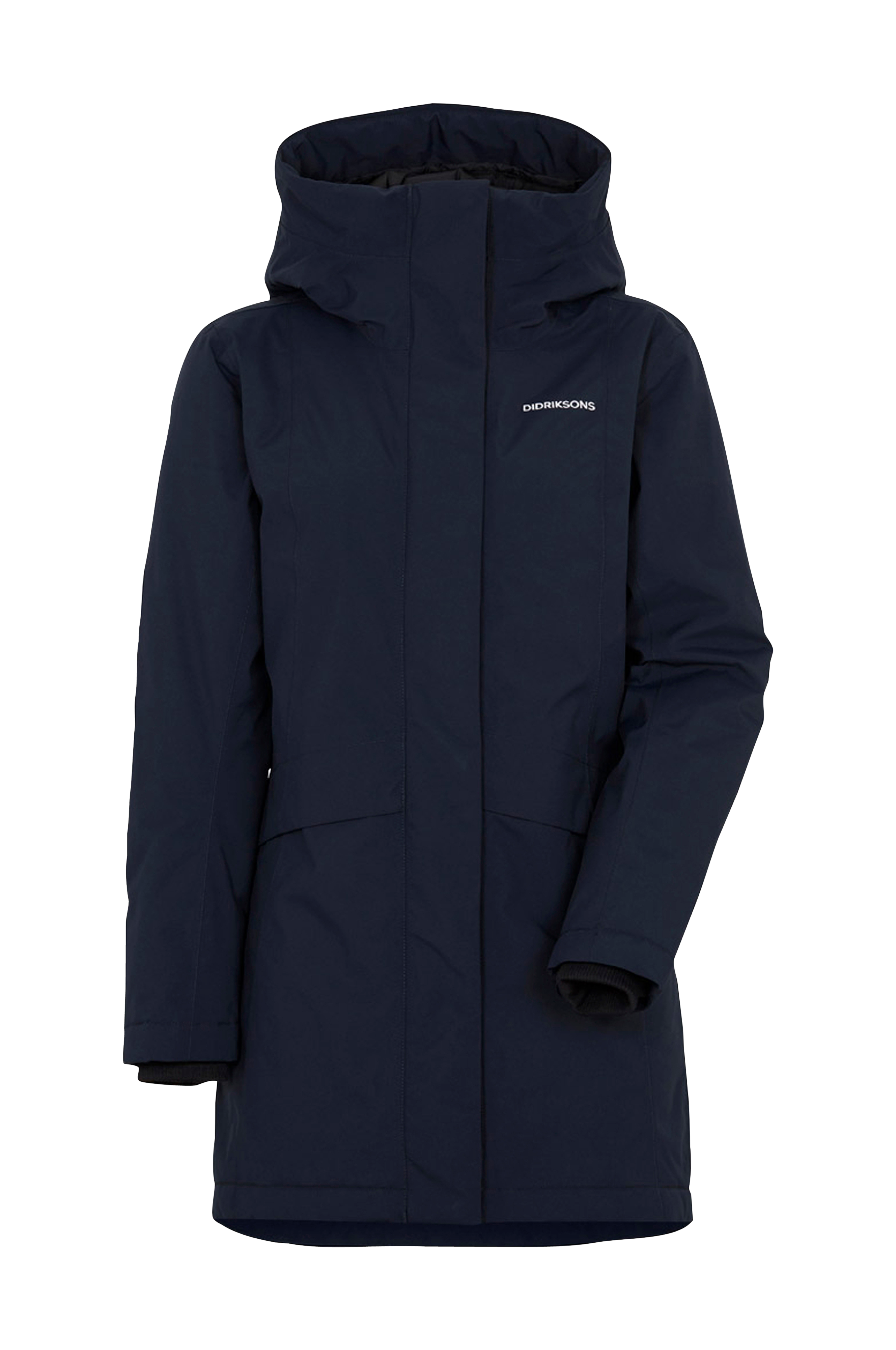 Fast, justerbar hette som faller fint på kragen når den ikke brukes. Høy krage. Lukkes med toveisglidelås og vindstolpe over glidelåsen som lukkes med trykknapper. Vrangbord i ermekantene. Refleksdetaljer ved ermekantene som er synlige når kanten brettes opp. To lommer med lommeklaff med knapp og mykt, børstet fôr. En innerlomme med knapp. Snøring med stoppere i midjen. Vannavvisningen er uten PFC. Lengde ca. 86 cm i str 36.