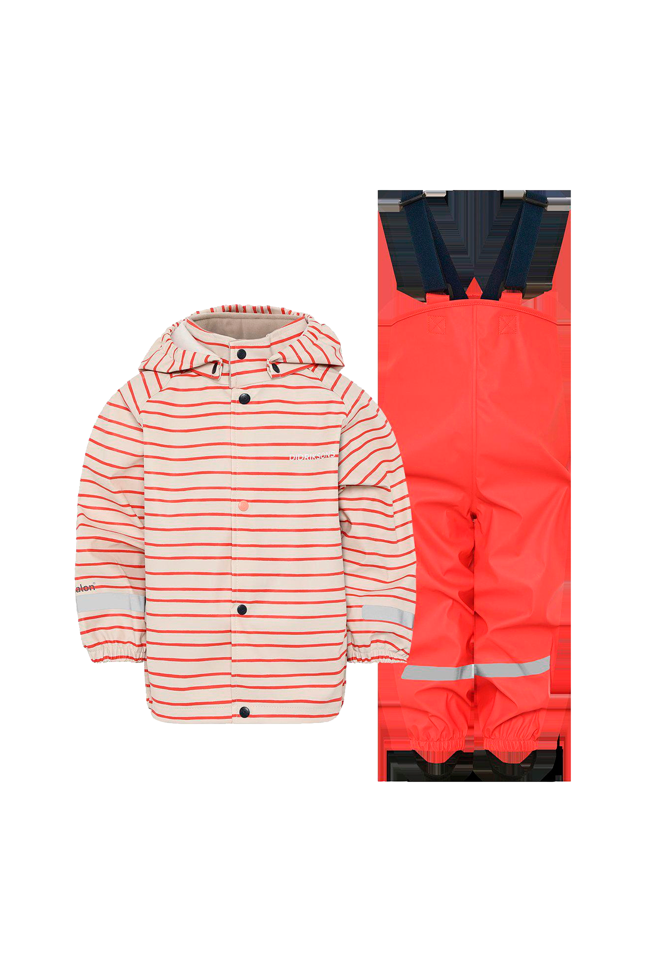 • 2-delt regnsett i vanntett, vindtett Galon • Forseglede sømmer • Ufôret modell med fireveis stretch • Avtagbar hette med gummistrikk i sidene • Høy, fleece-foret krage • Jakke med trykknapper • Bukser med justerbare seler • Trykknapper i sidene • Gummistrikk i enden av benet • Avtagbare fotstropper i silikon • Refleksdetaljer • Vannsøyle: 8000 mm