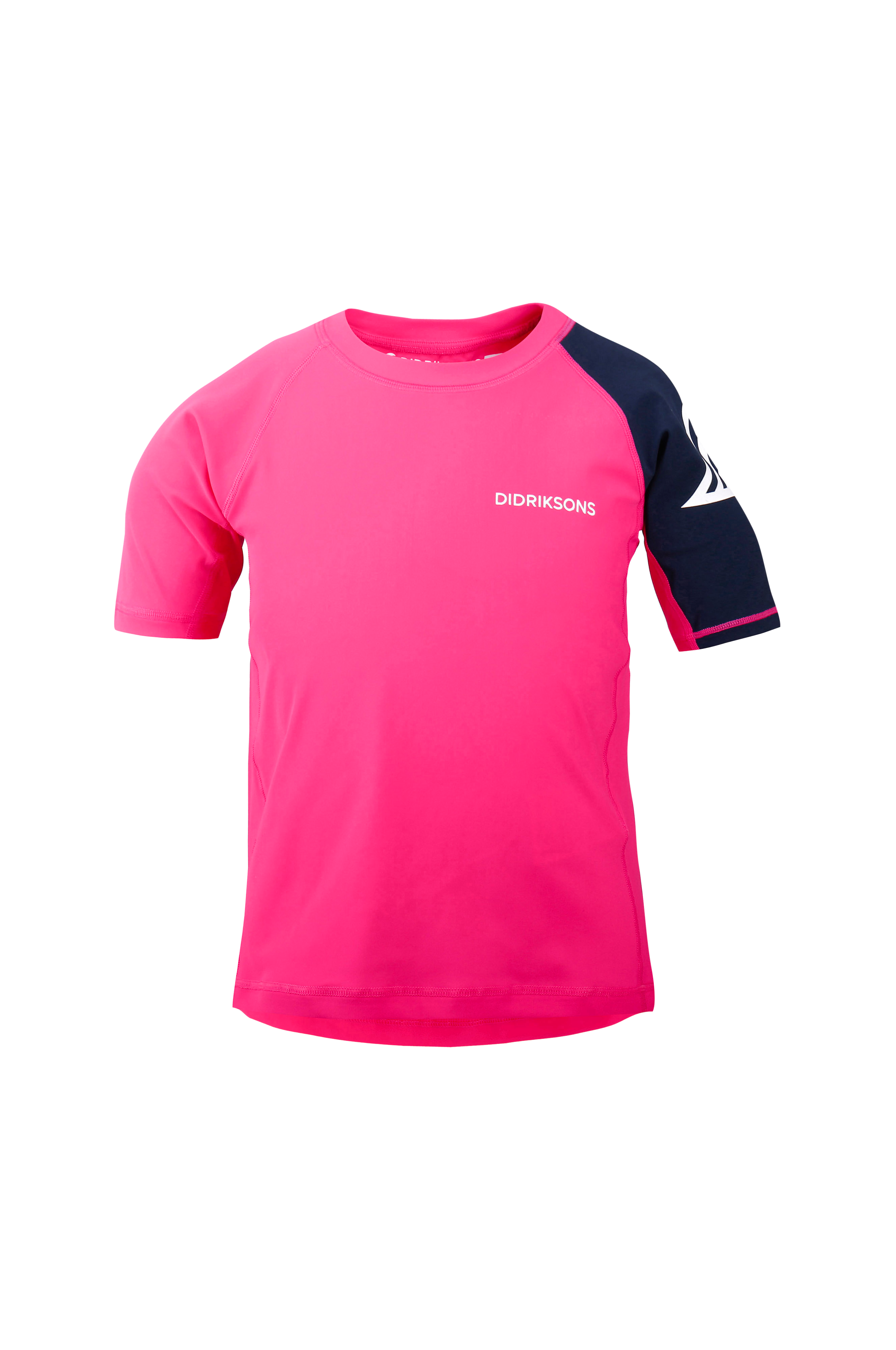 UV-T-shirt Surf Kids SS UV Top2 fra Didriksons beskytter mot solens stråler med UPF50+. T-shirten er produsert av et mykt materiale som er konstruert slik at det beskytter mot solens stråler og ikke ødelegges eller blekes av klor eller saltvann. Mister ikke formen og tørker raskt.
