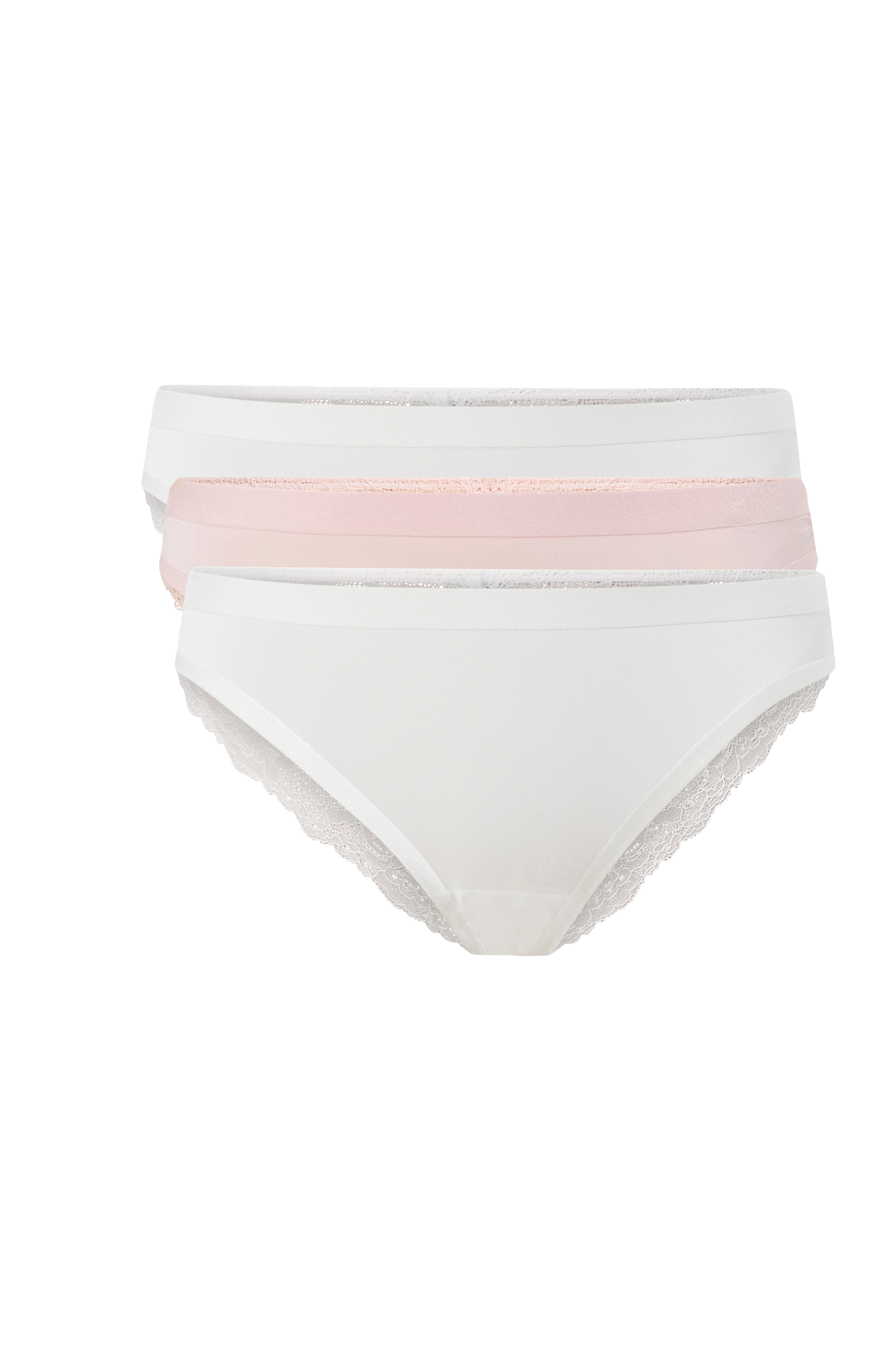 Truser i blank trikot med blondebakside. Blank strikk foran i midjen. Fôret skritt. Selges i 3-pakning.