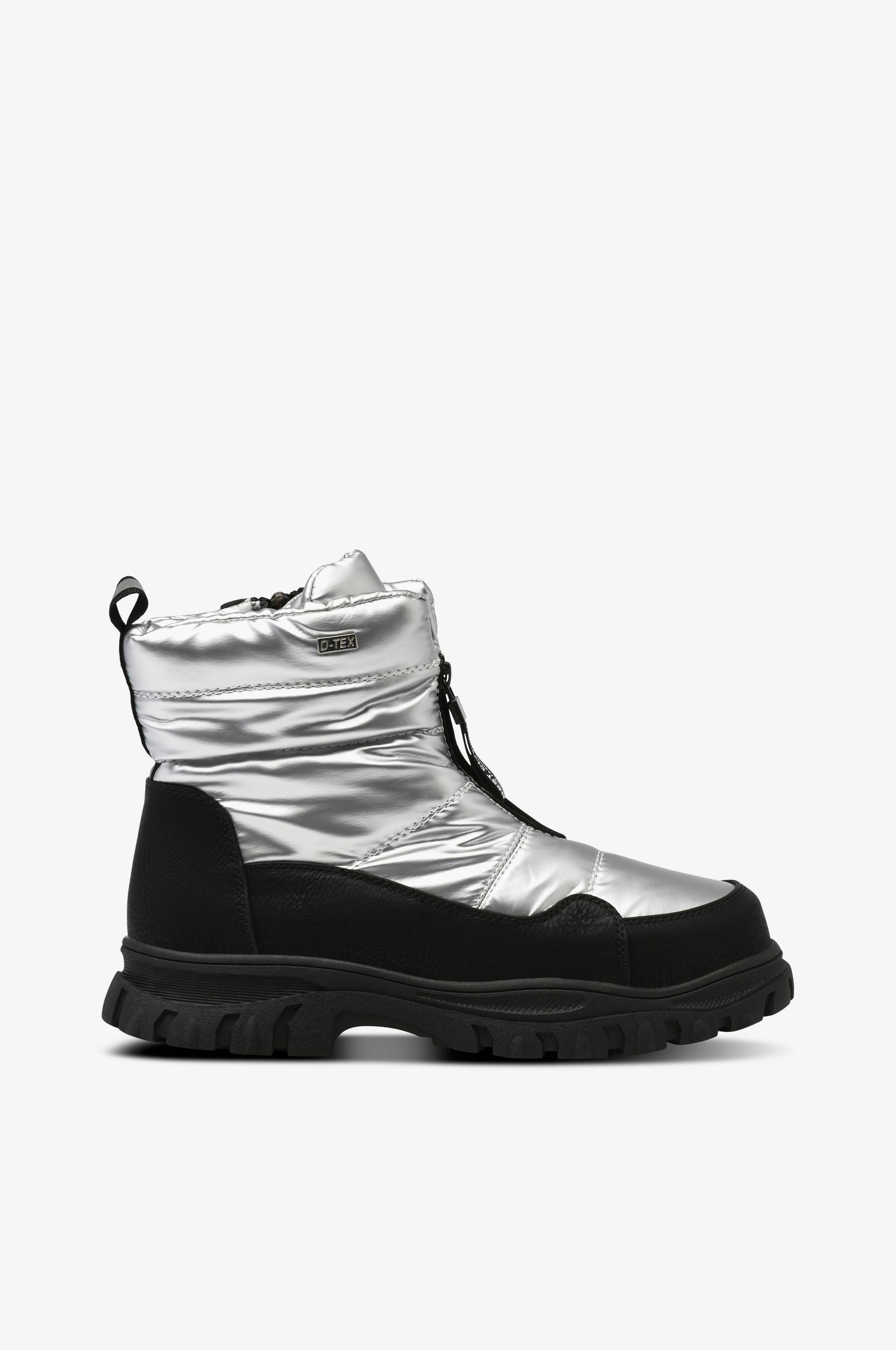 • Sølvaktige boots• Polstret skaft i syntet• Forsterkning i skinnimitasjon• Glidelås på innsiden av skaftet• Dekorativ glidelås med tekst foran• Myk foring i kunstig skinn• Skafthøyde: 12 cm i størrelse 37