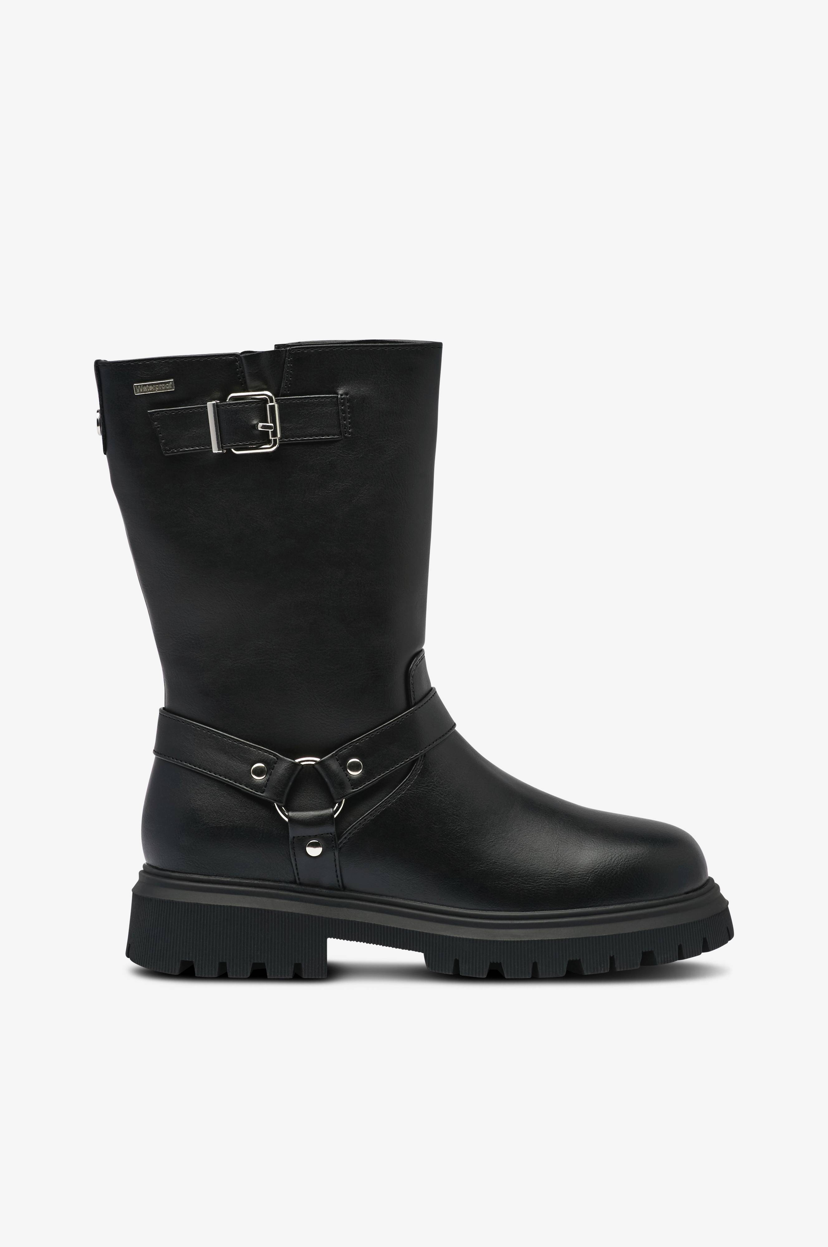 • Vanntette boots i skinnimitasjon med dekorative stropper på skaftet• Glidelås på innsiden av skaftet• Varmende tekstilfôr• Grovmønstret yttersåle i gummi• Skafthøyde: 22 cm i størrelse 37